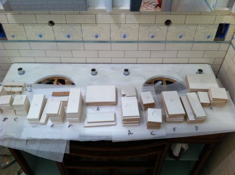The remaining tiles are almost entirely “cuts”… on the tile saw. To save time during installation, Rob made all the cuts first, which took …many… hours. Here’s the coded stacks ready to go: