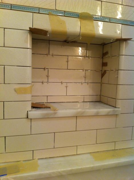 Once the cuts were done, we started tiling… the method is pretty smooth- I put the mud on the back of the tile and hand it to Rob in the tub. We finished up the tub surround and edge of the window sill: