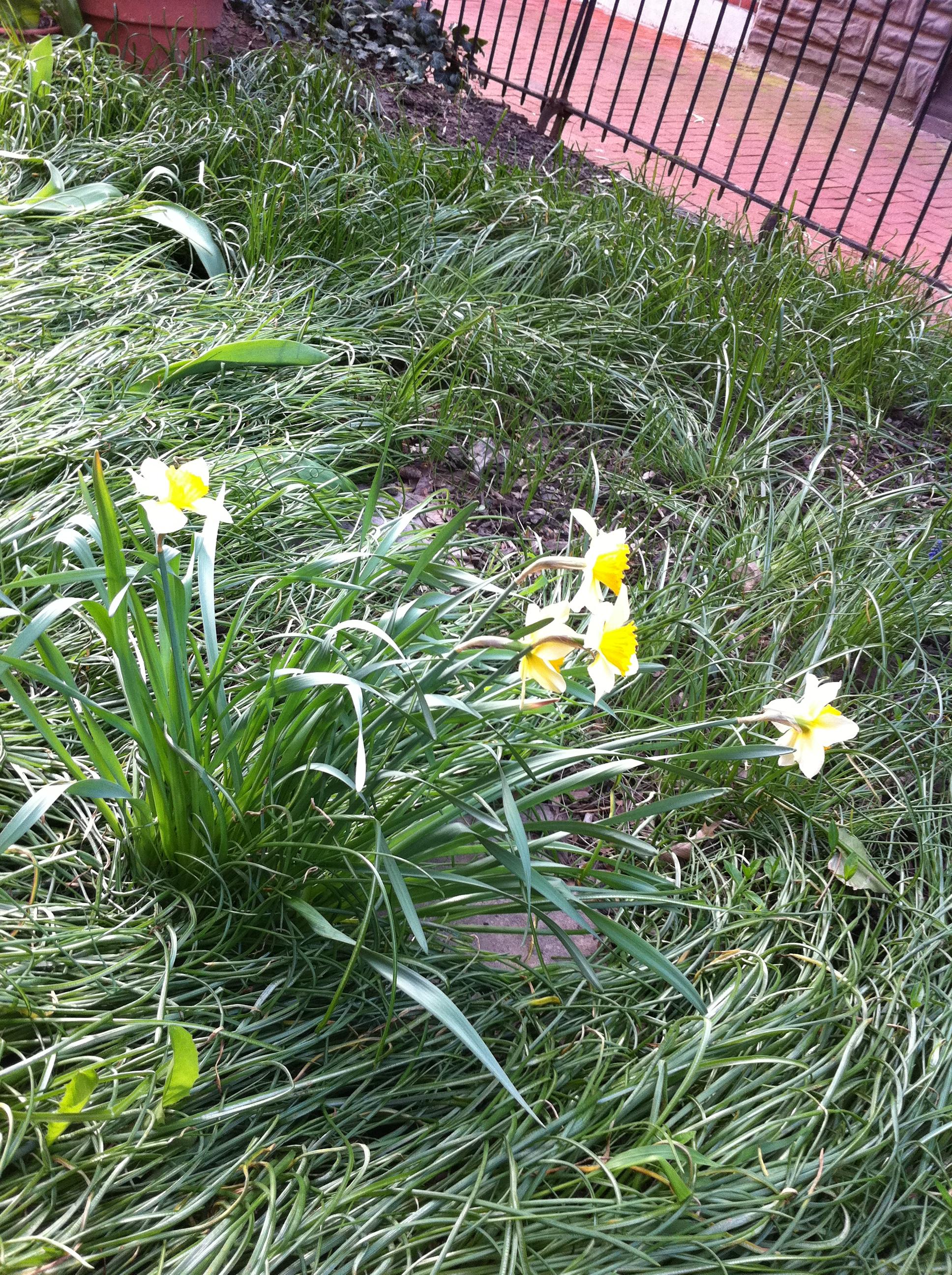 Garden Shot April 15, 2011 · by madisonsquare · Bookmark the permalink. · Some daffodils! Amazingly, only a month after out neighbors bloomed 🙂 Pretty purple flowers, and the ‘grass’ we have- eventually will have little white flowers. Once those bloom, it will be time to start thinking about our summer garden! Share this: Click to email a link to a friend (Opens in new window) Email Click to share on Facebook (Opens in new window) Facebook Click to share on Pinterest (Opens in new window) Pinterest Like Loading... Related