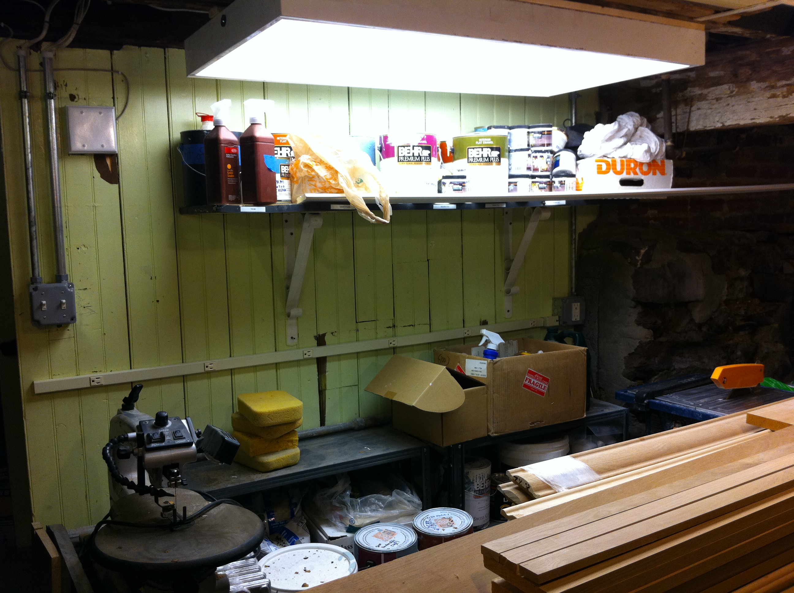 We now have a power strip, and a bright fluorescent light, currently highlighting some of our paint collection, trim, jigsaw and tile saw.