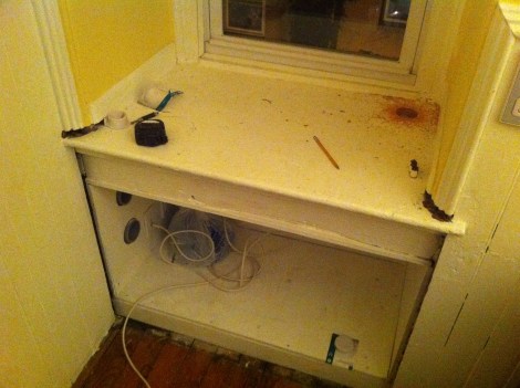 As part of the sill install, we spent some time thinking about the AV cabinet we’re creating under one window. With square footage at a minimum, we decided way back when to carve an area out of our mansard roof for all the ‘stuff’ that usually goes with tv watching/ music listening.