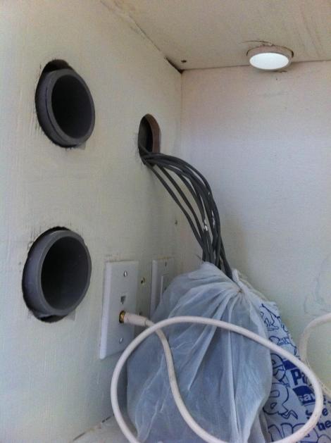 Before we got insulation up here we finished off the inside of the cab, knowing we’d have to vent the cabinet somehow. We drilled two holes and added a PVC sleeve to each: