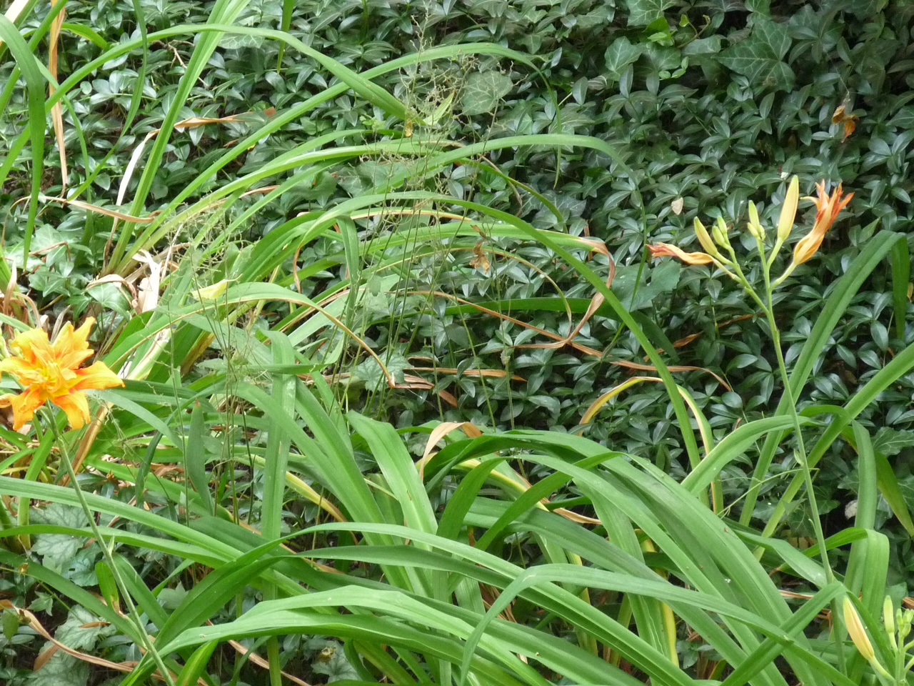 Everything is filling in well, the mulberries are done falling, the supposedly shade loving potted dahlias died, but begonias and coleus are doing really well as are the impatients. Liriope is green, but geraniums haven’t bloomed again (yet).