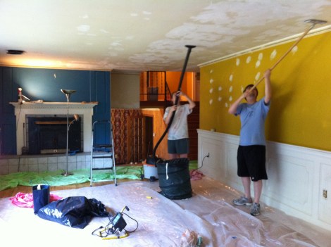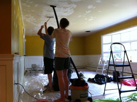J&L sanding and vacuuming… The previously wallpapered living room ceiling. Check out the awesome window to the right: