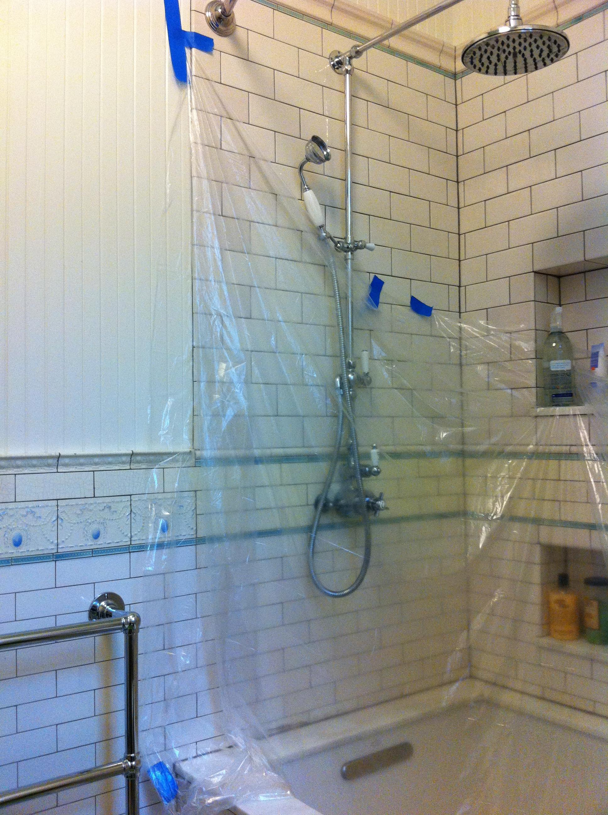 Then taping up some plastic to protect the work from errant shower spray (walking a fine line between washing off 12 hour flight plane debris and obeying recommended dry-times):