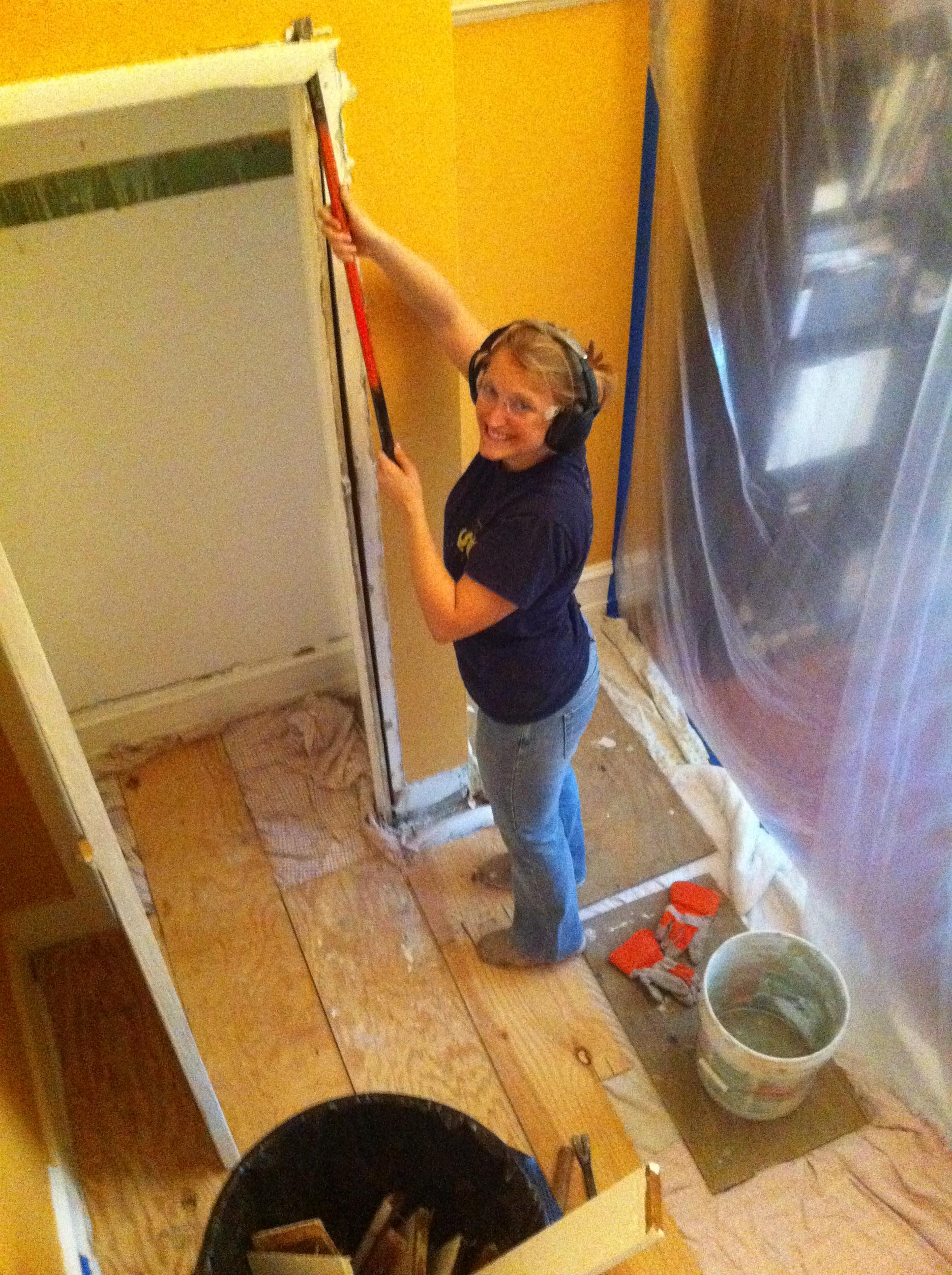 I’m demo-ing as high as I can reach. Meanwhile Rob was up on the ladder covering up the ductwork.