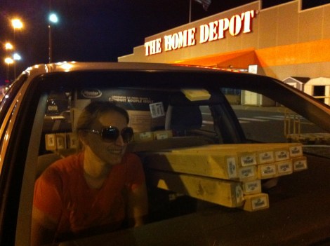 Another successful trip to gather supplies without completely bottoming out our car. 17 2x3x8′, 12 2x3x10′, 6′ 2x6x8′ and two 24×8′ mdf boards. Not to mention a gas tank for our grill, framing nails, flex duct, etc: