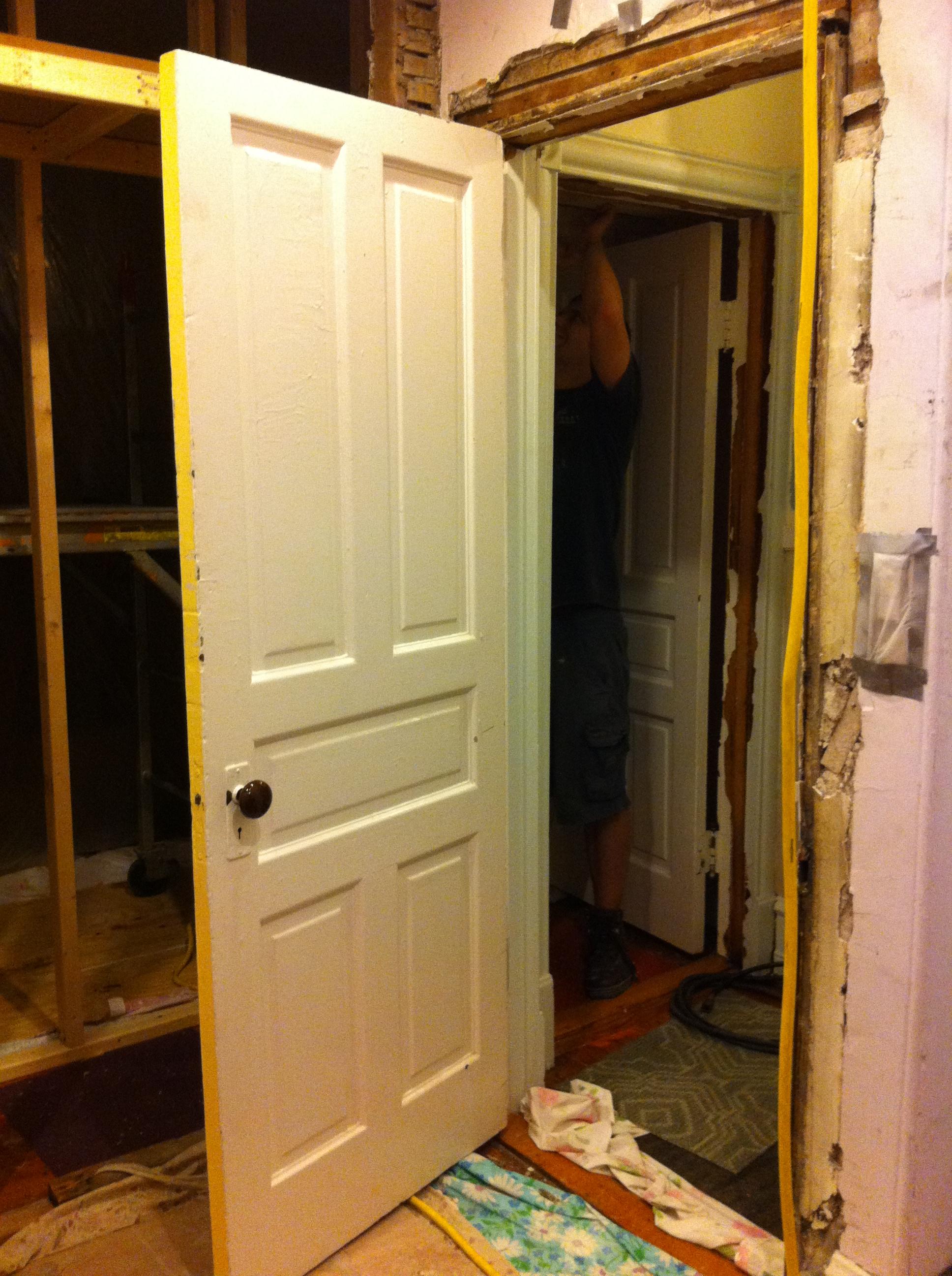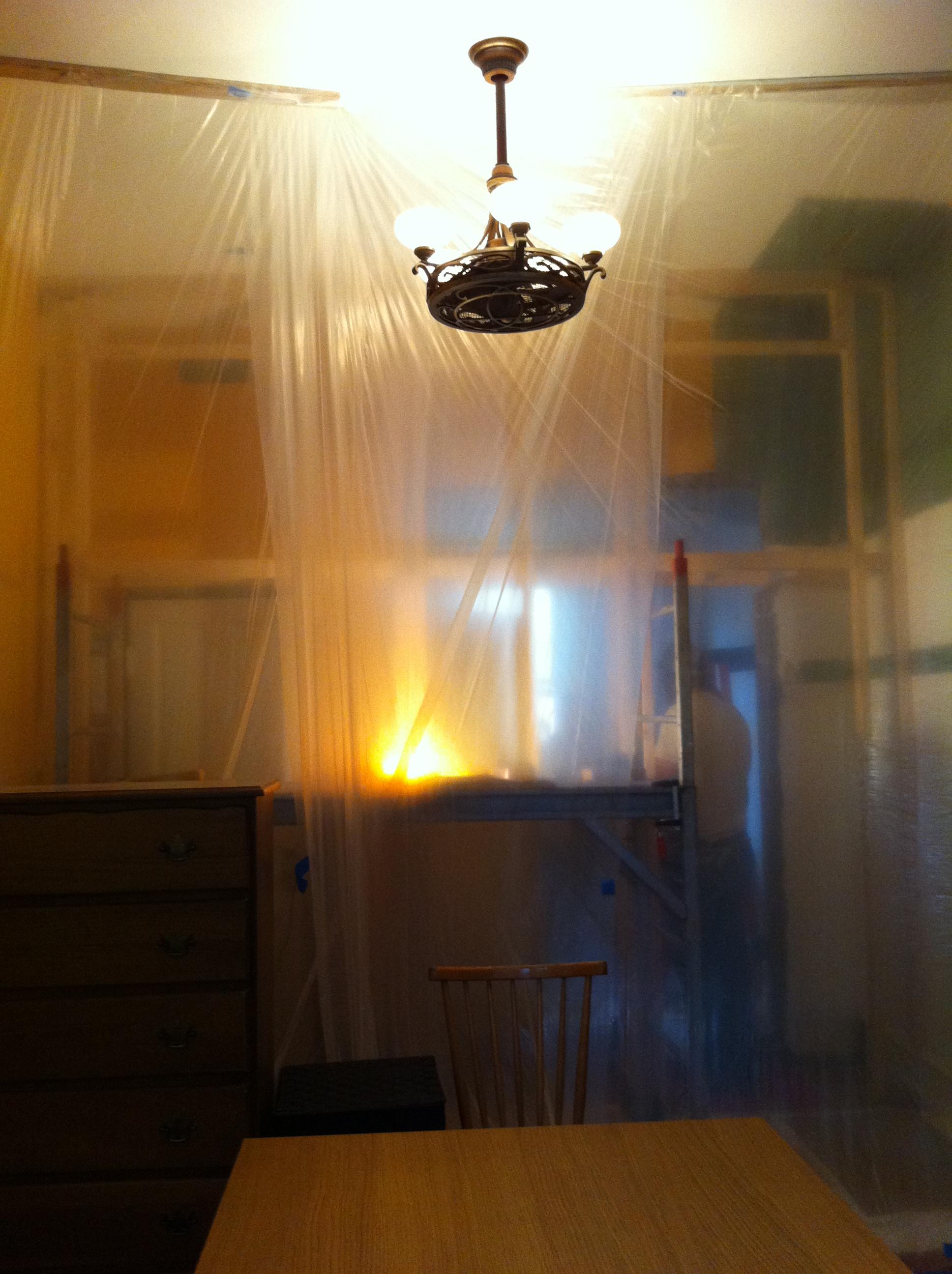 Please ignore our amazing array of carpet samples/ drop cloth patterns. I think we make up for it with the coordination of the extension cord to the yellow door paint.
