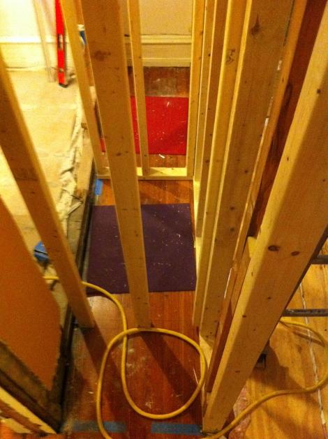 Rob and my Dad framed pretty much all of the closet project today. Here is a veiled view from the bay window side of the room: