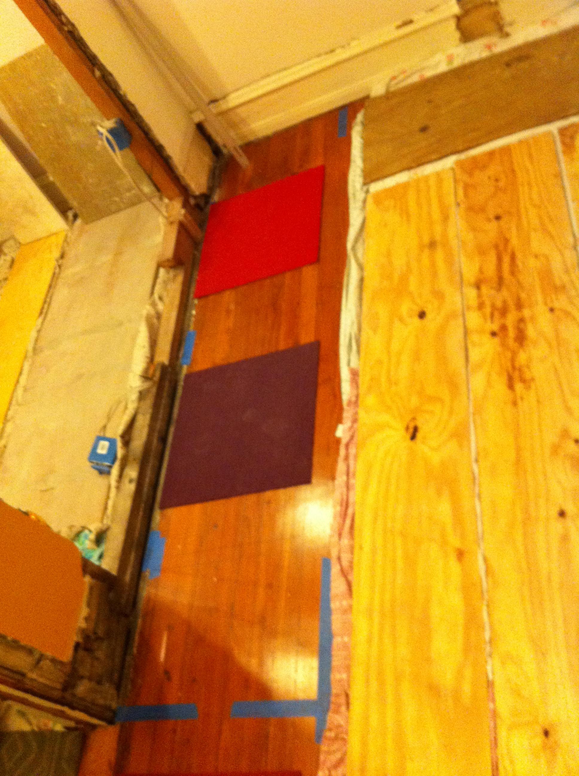 We laid out the closets tonight for framing- red carpet sample is the orange bedroom closet, purple is for the little bedroom, & linen at the bottom of the photo. If anyone is wondering if these closets will fit clothes hanging on a coathanger, with a shelf above, the answer is yes, if you have mini coat hangers. Kidding. They are regular depth closets.