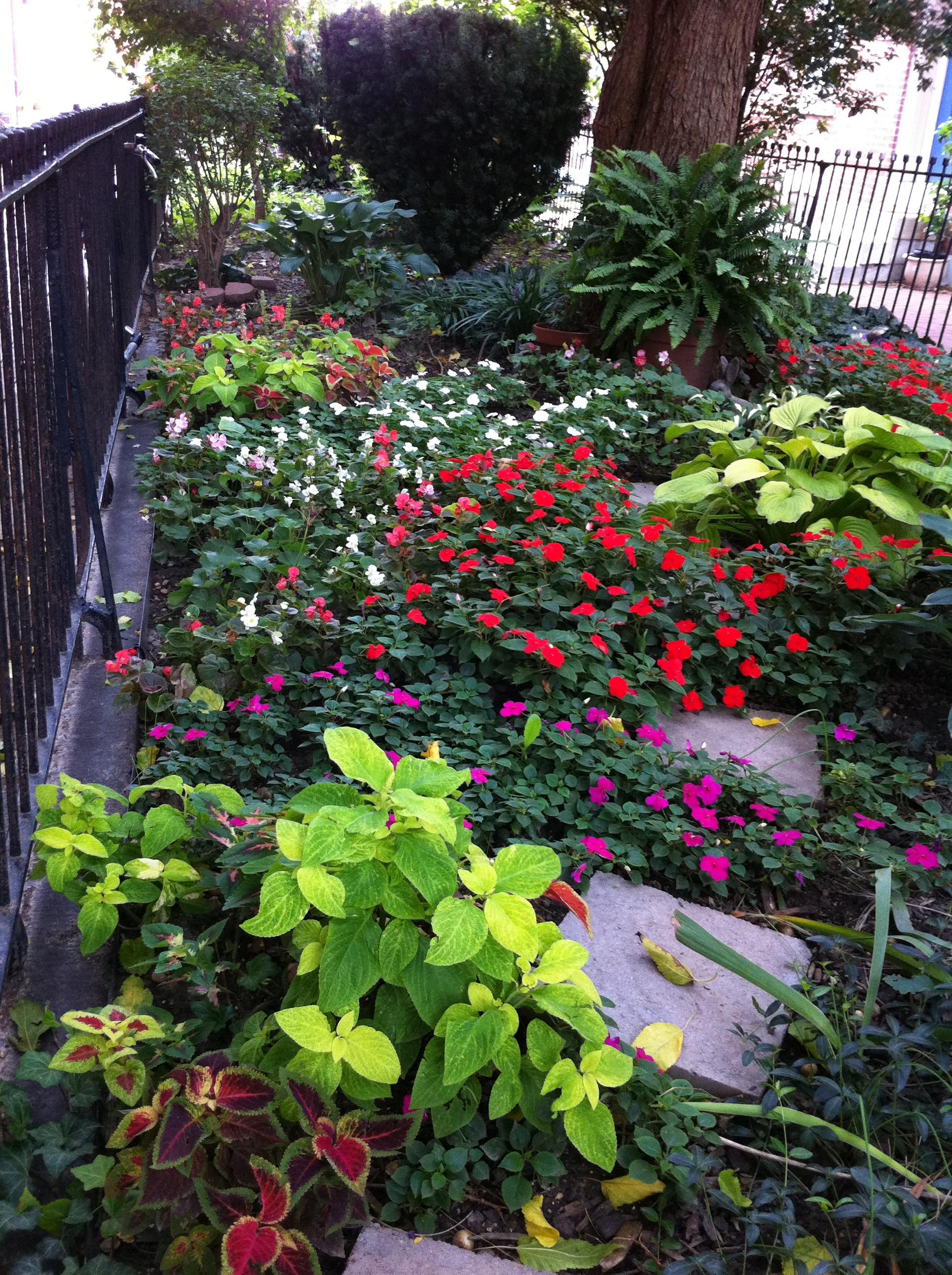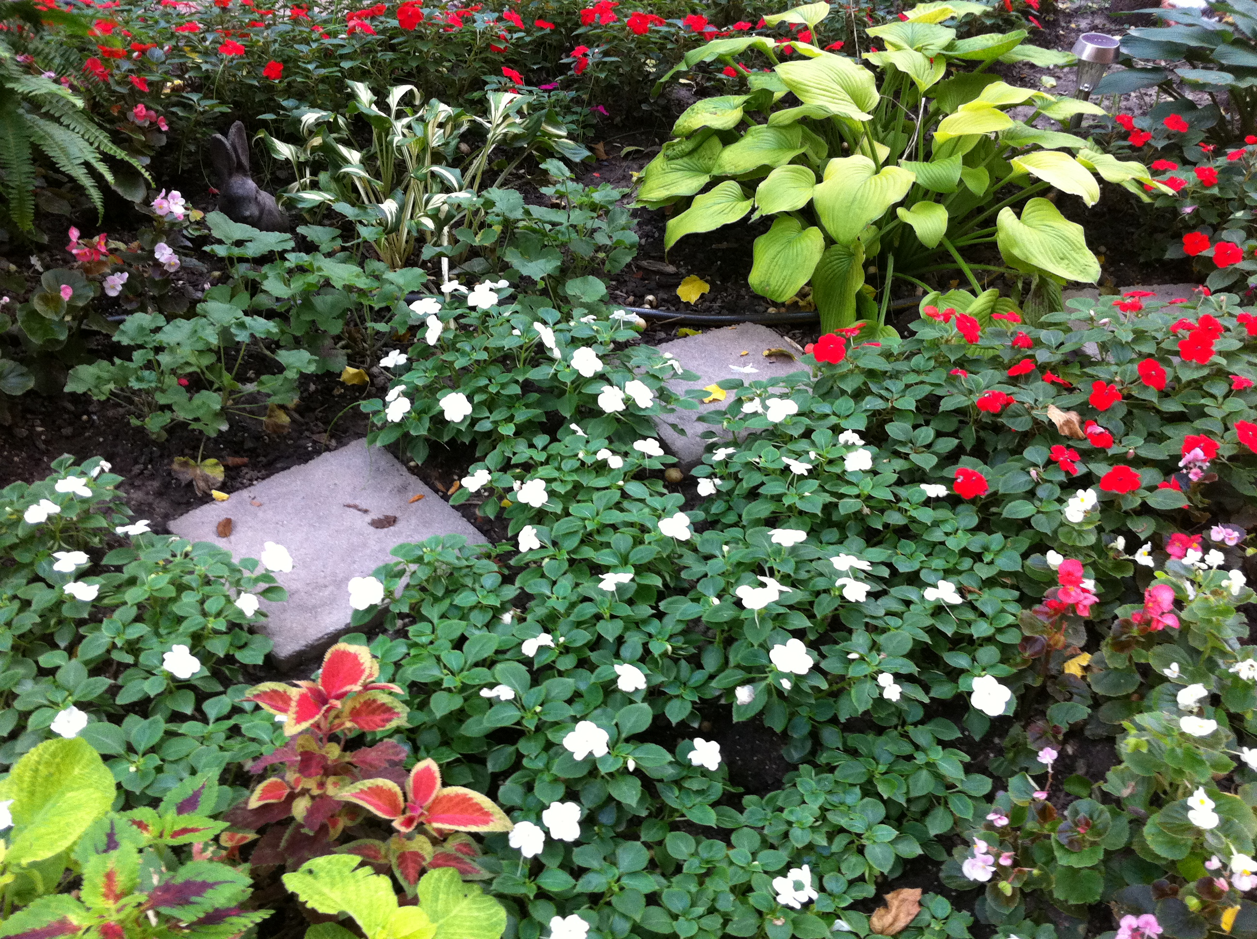 Our garden really filled in this year, and as always the shade-loving impatiens (red, white, pink) and coleus (bright green/maroon in foreground) are still going strong, despite droughts, monthlong torrential rains, a hurricane, and earthquake: