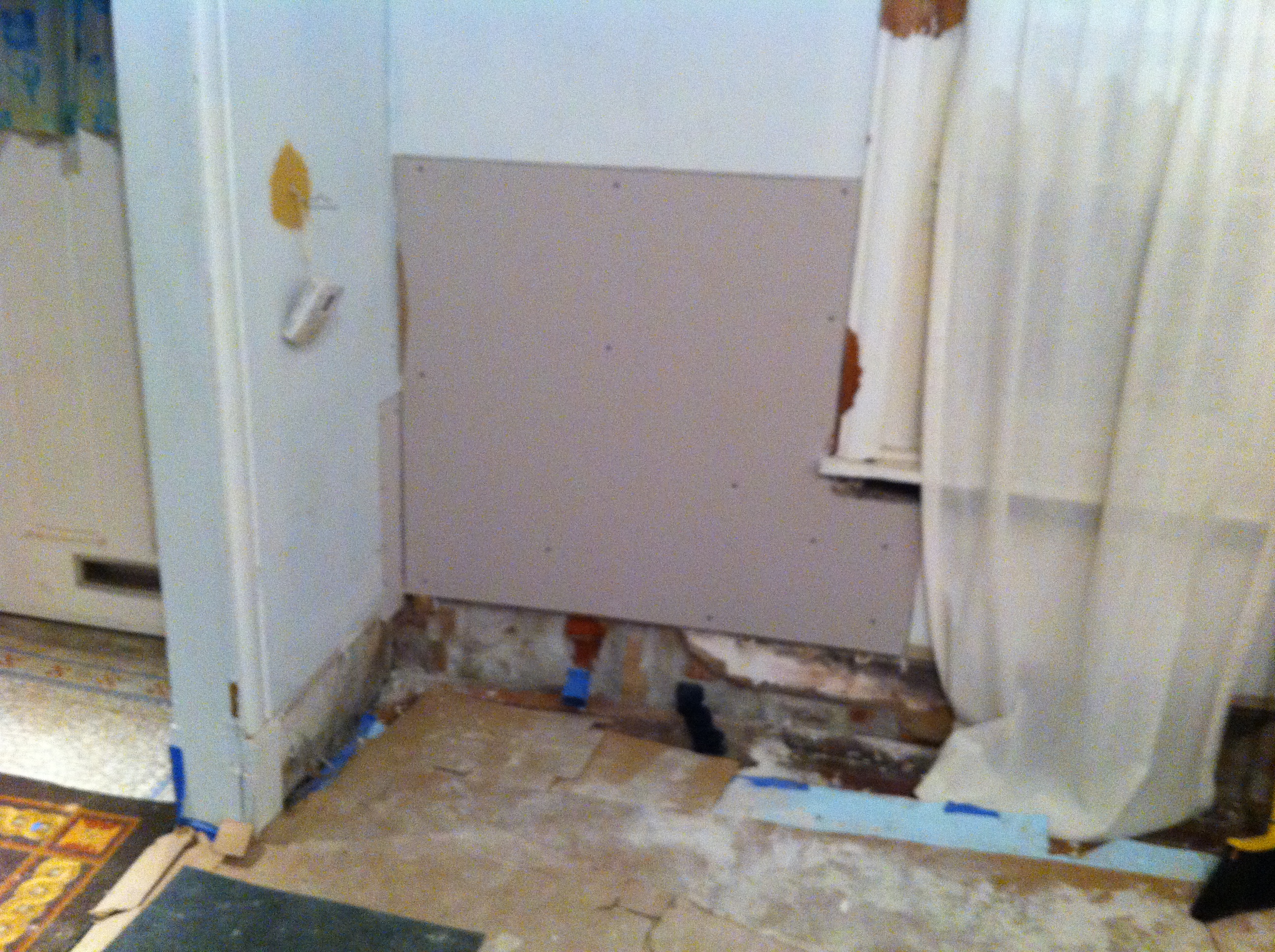 Next step: mud & baseboard. (ps: see our front hall mosaic floor peeking out from yet another carpet sample?)