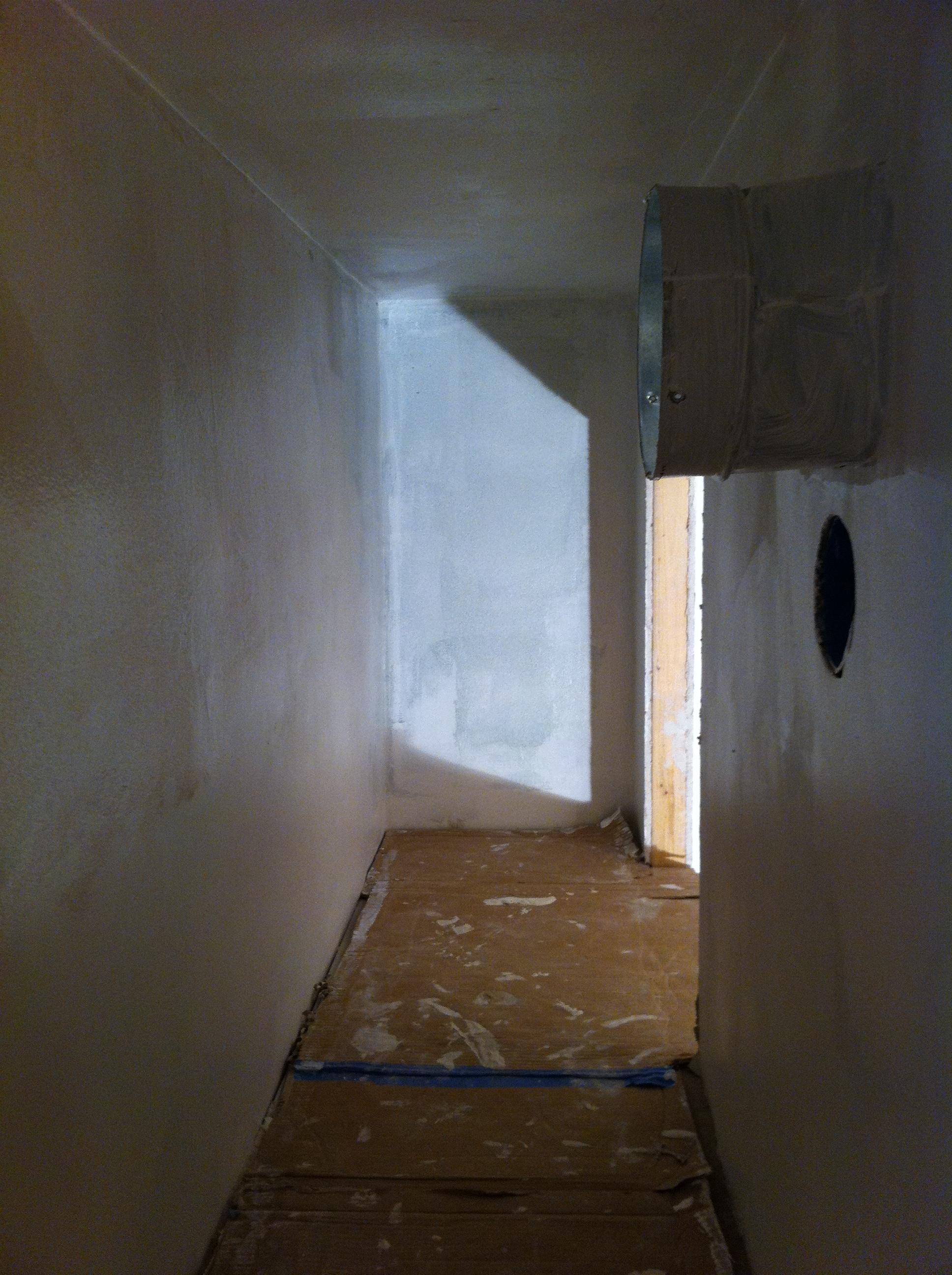 Tonight the power three (Rob, my dad and I) did a power (three) hour and finished spackling, sanding and of course… Primed! We primed the upper closet, shown here, and all the lower closets: