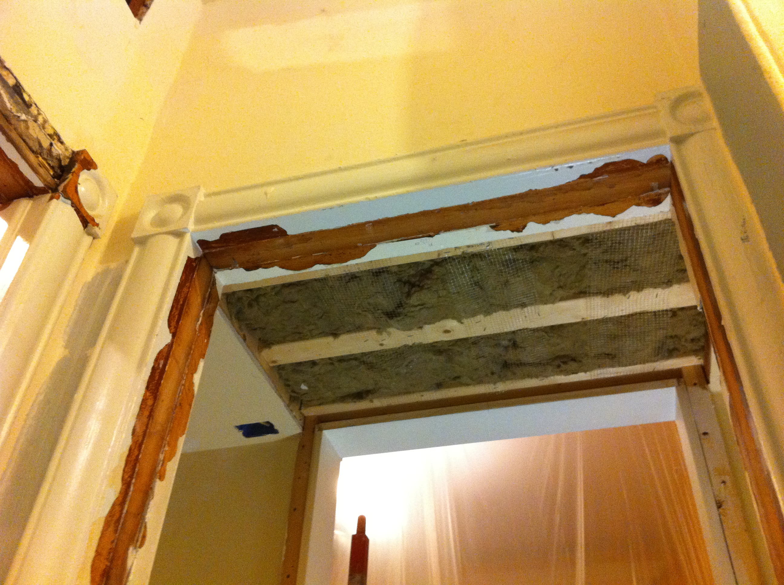 And up our new ceiling panel goes! It will match the closet doors on either side, making a deep cased opening between the spaces…