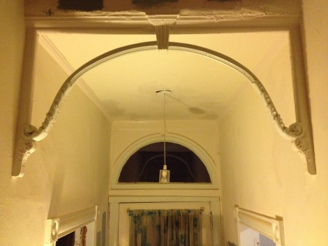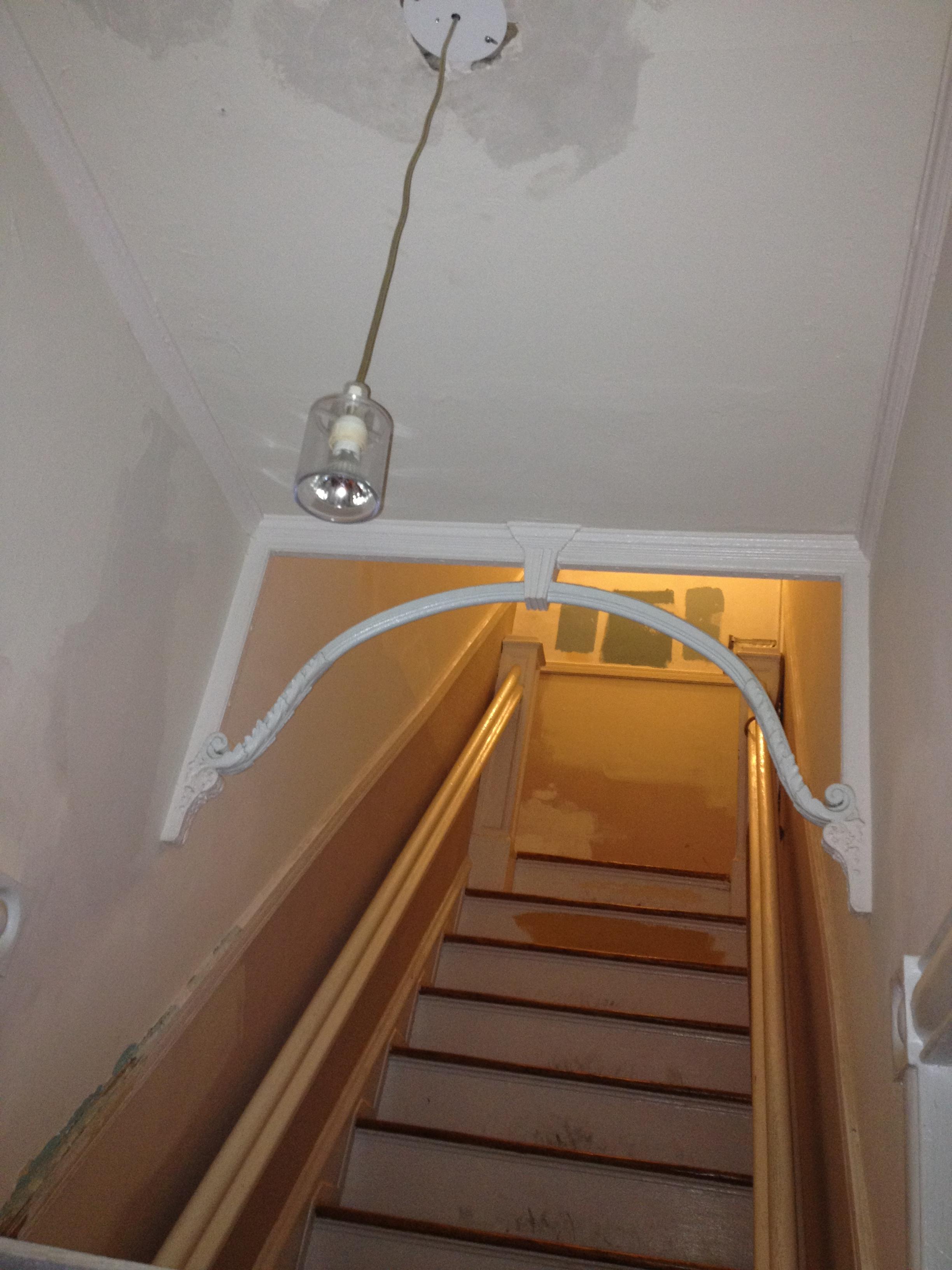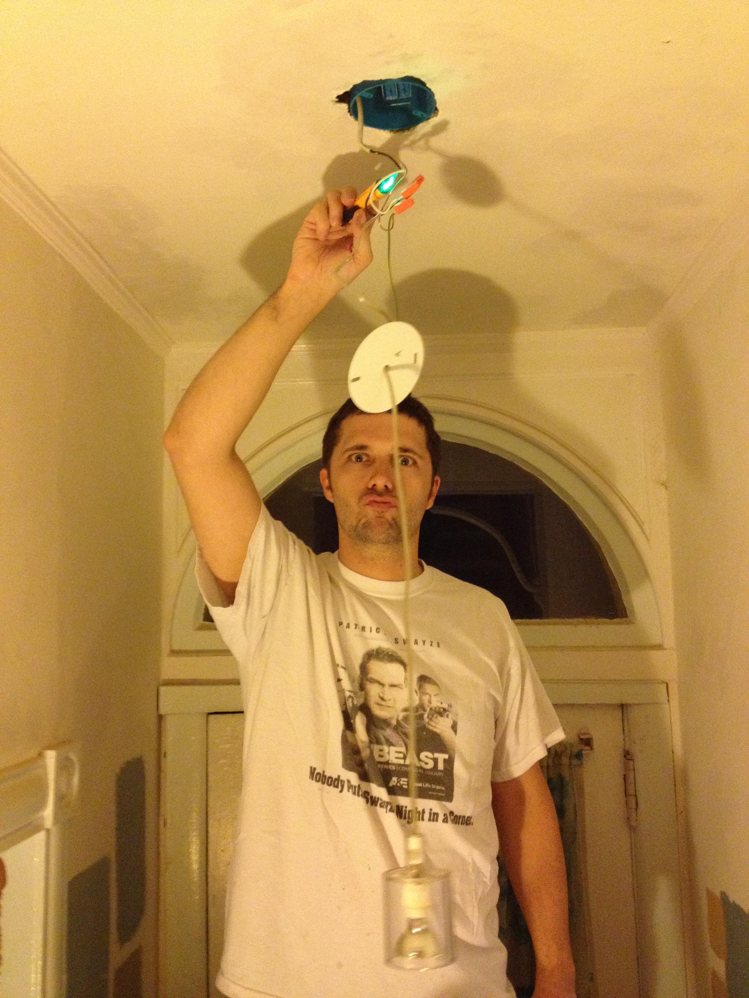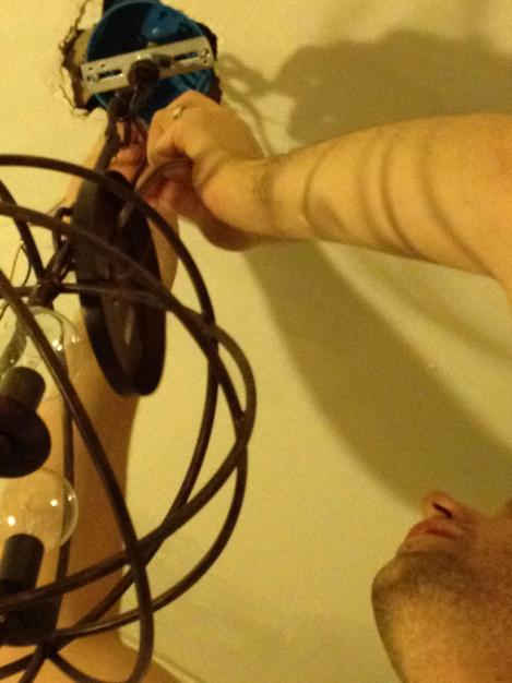 So you may have guessed already what the secret project was… We bought a new fixture for the front hall! Tonight we took the temp fixture down: