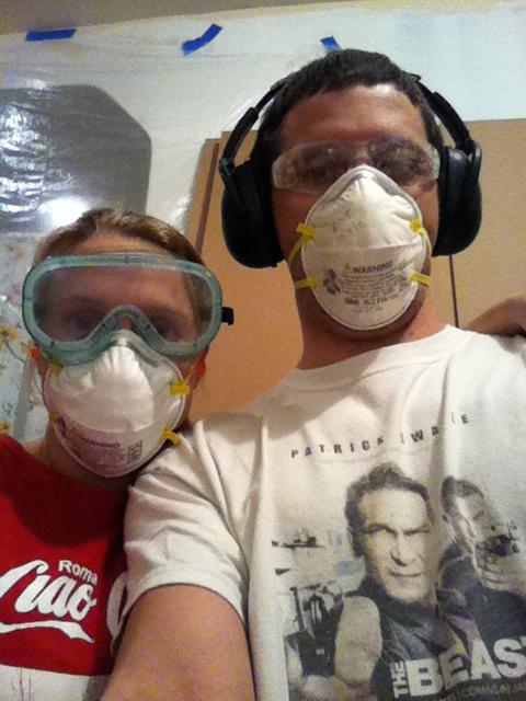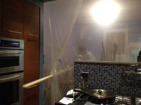 Tonight I painted more trim. Rob made the linen closet & little closet jambs. Here is a view of the wood shop (dining room) from the kitchen while I was on dinner duty. Rob was router-ing: