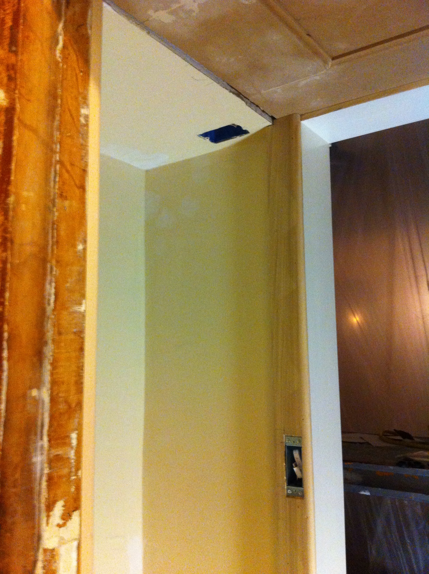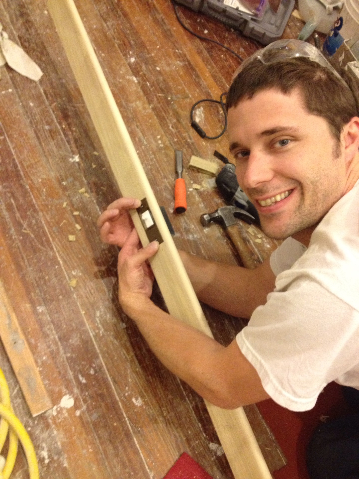 Chiseling out for the jamb switch in our upstairs wood shop (the little bedroom). It turns on the linen closet light when you open the door: