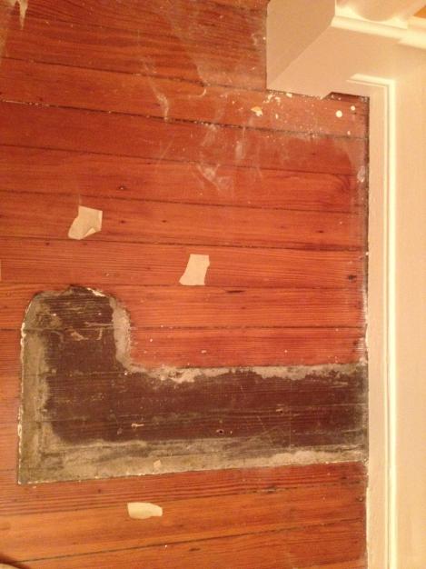 I’ll skip the painting pics tonight and instead show off the start of our mini floor refinishing project. There are 3 sections of newly-uncovered wood floor that need some love. First up, the old threshold into the orange bedroom. We moved the 1900-reno wide/ solid threshold a few feet to the new door location and uncovered this: