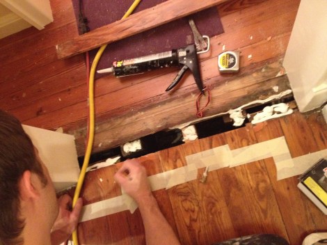 This project didn’t really get started until 10pm (see painting and poly-ing) so suffice to say there is more to come. However Rob did manage to resecure one of the boards at the threshold that was practically just laying in place without nails (so I am told):