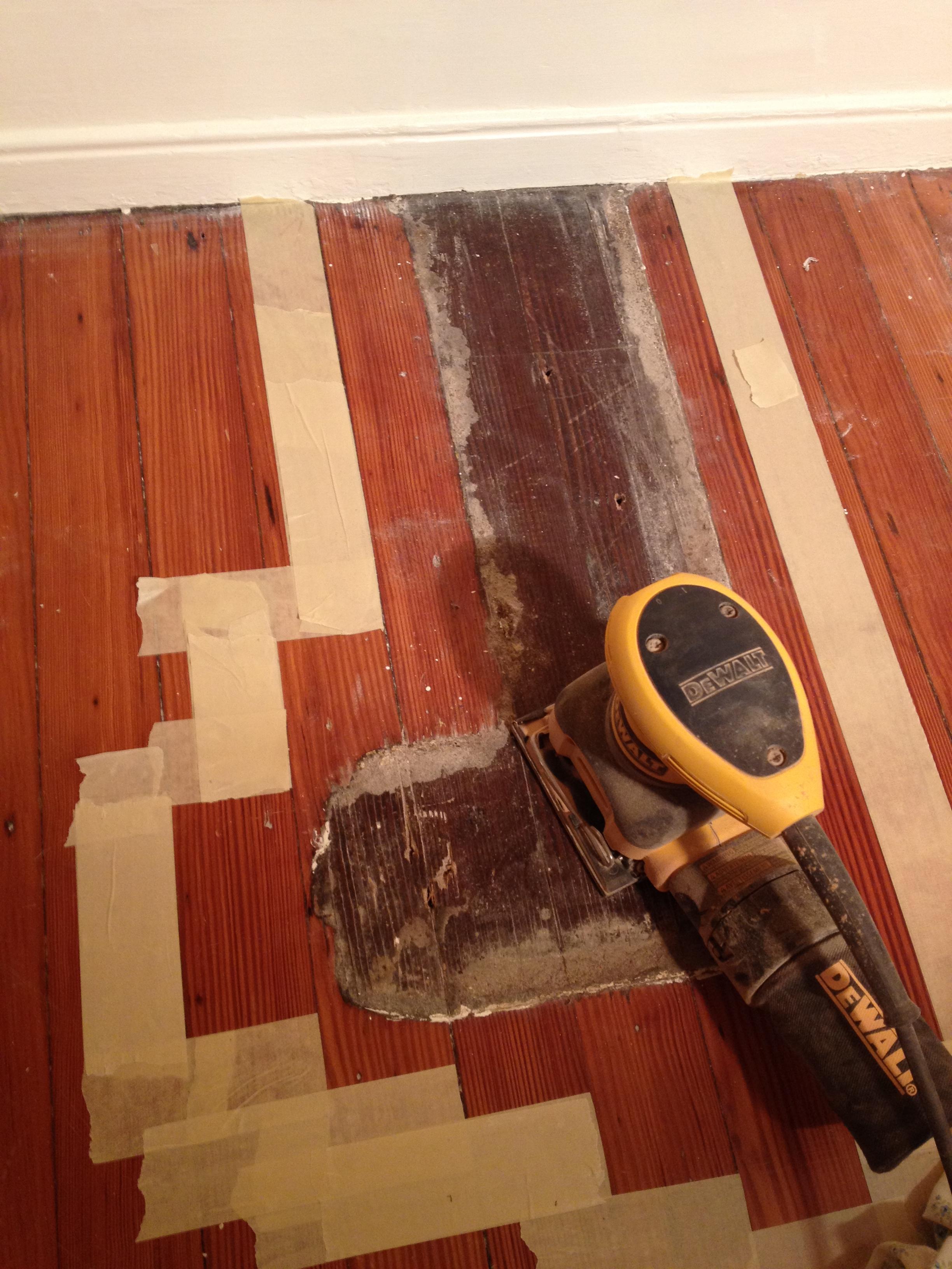 I also got started on the other two lumps of floor with our new sander & some 60- grit paper. The tape outline is to guide the sander.