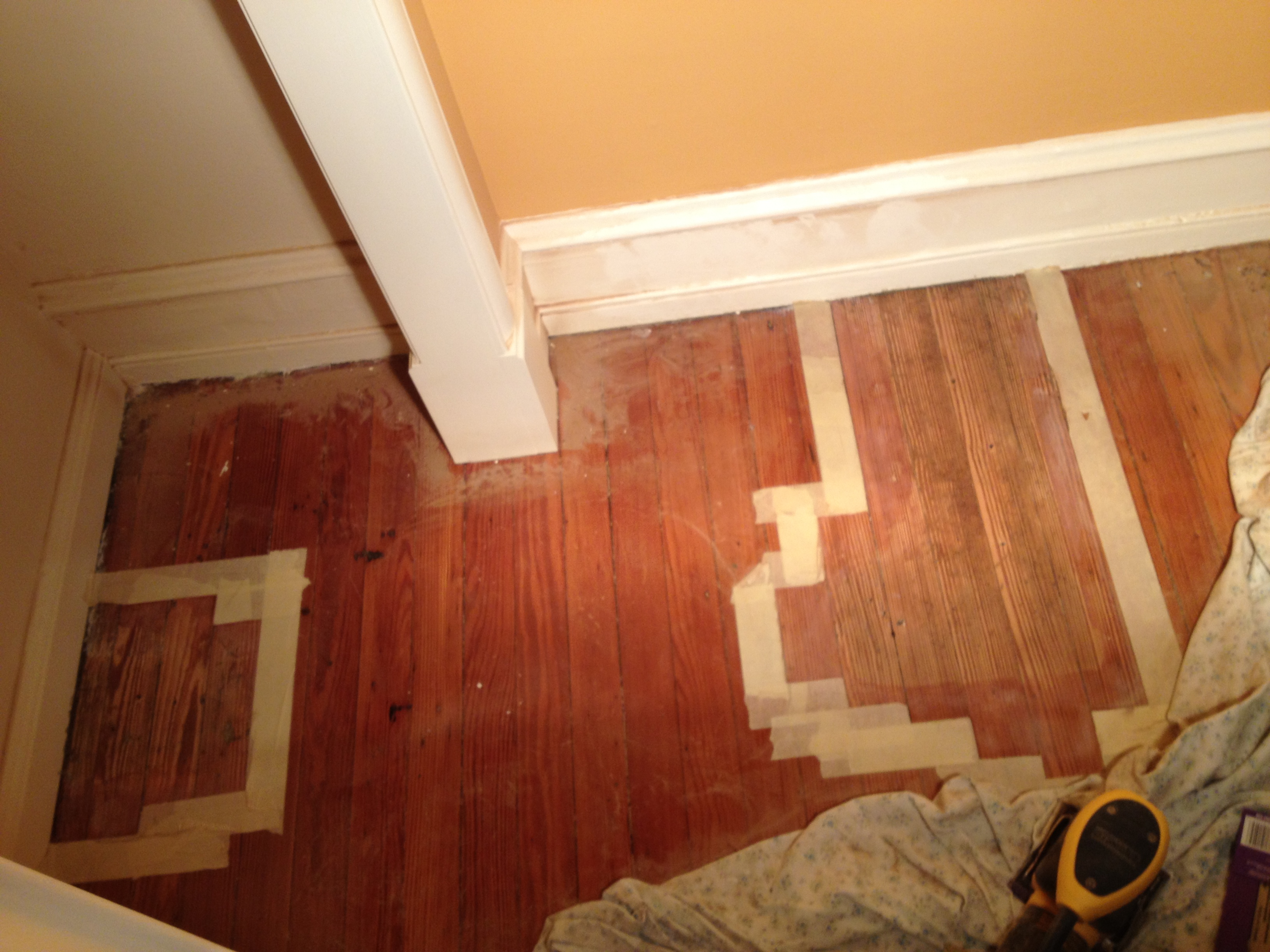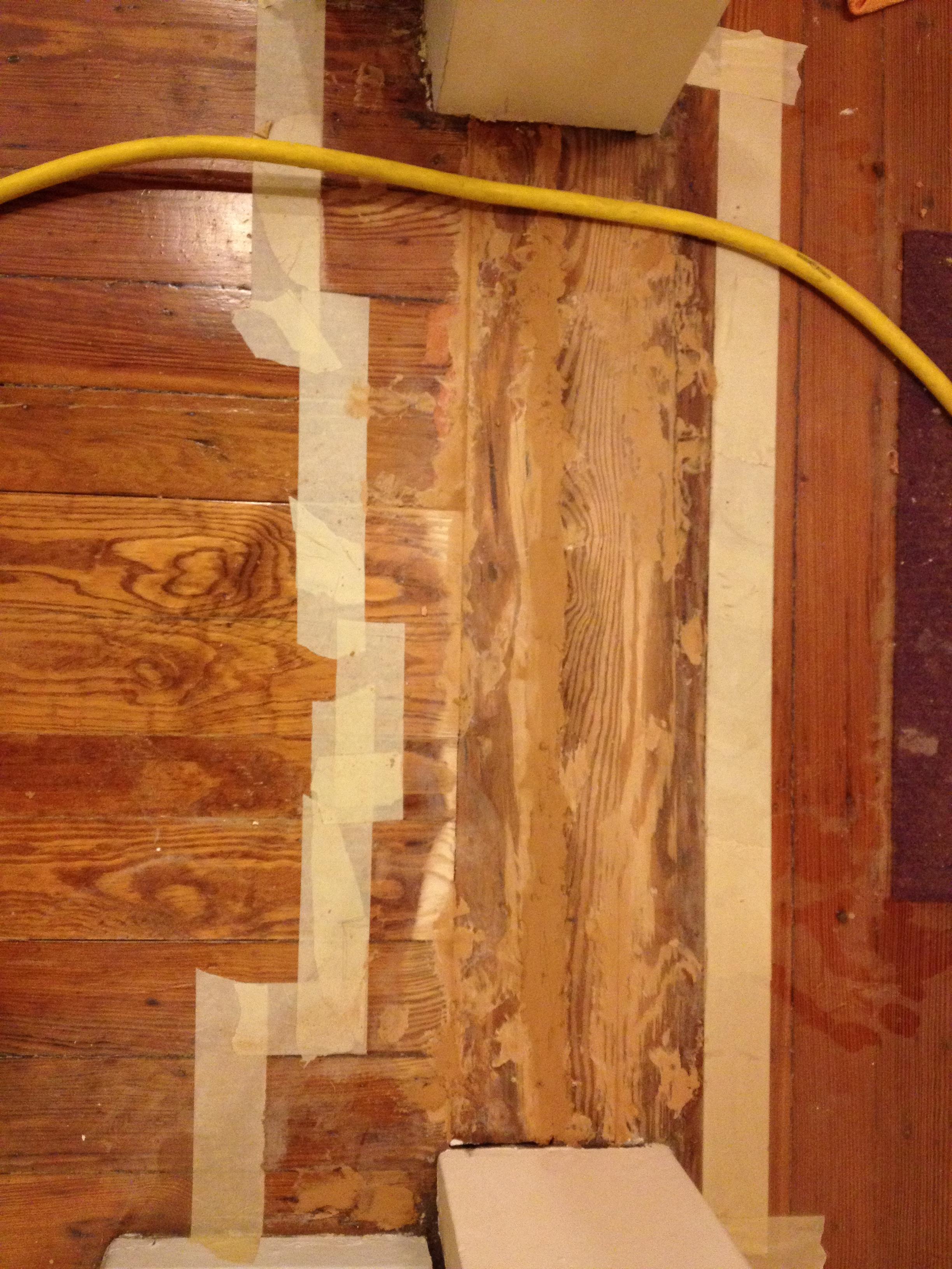 After a hard night of sanding away, I used up every last drop of our golden-oak wood putty on the three areas. Here’s the (old) threshold now:
