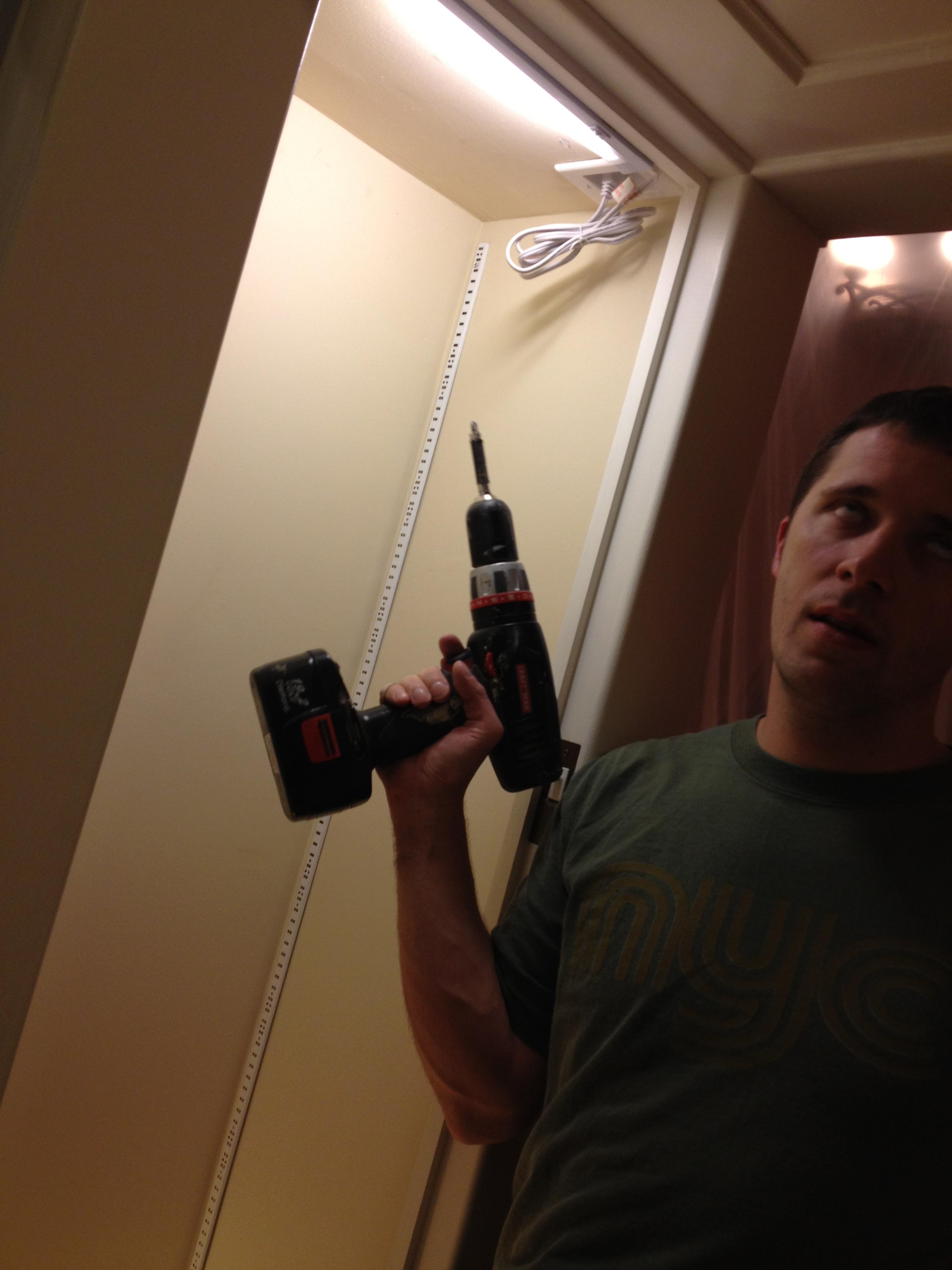 Rob rolling his eyes at annoying shelving track screws, which he was working on between painting doors, but after I goof-offed the track stickers / spilled the bottle of goof-off for the second time this week: