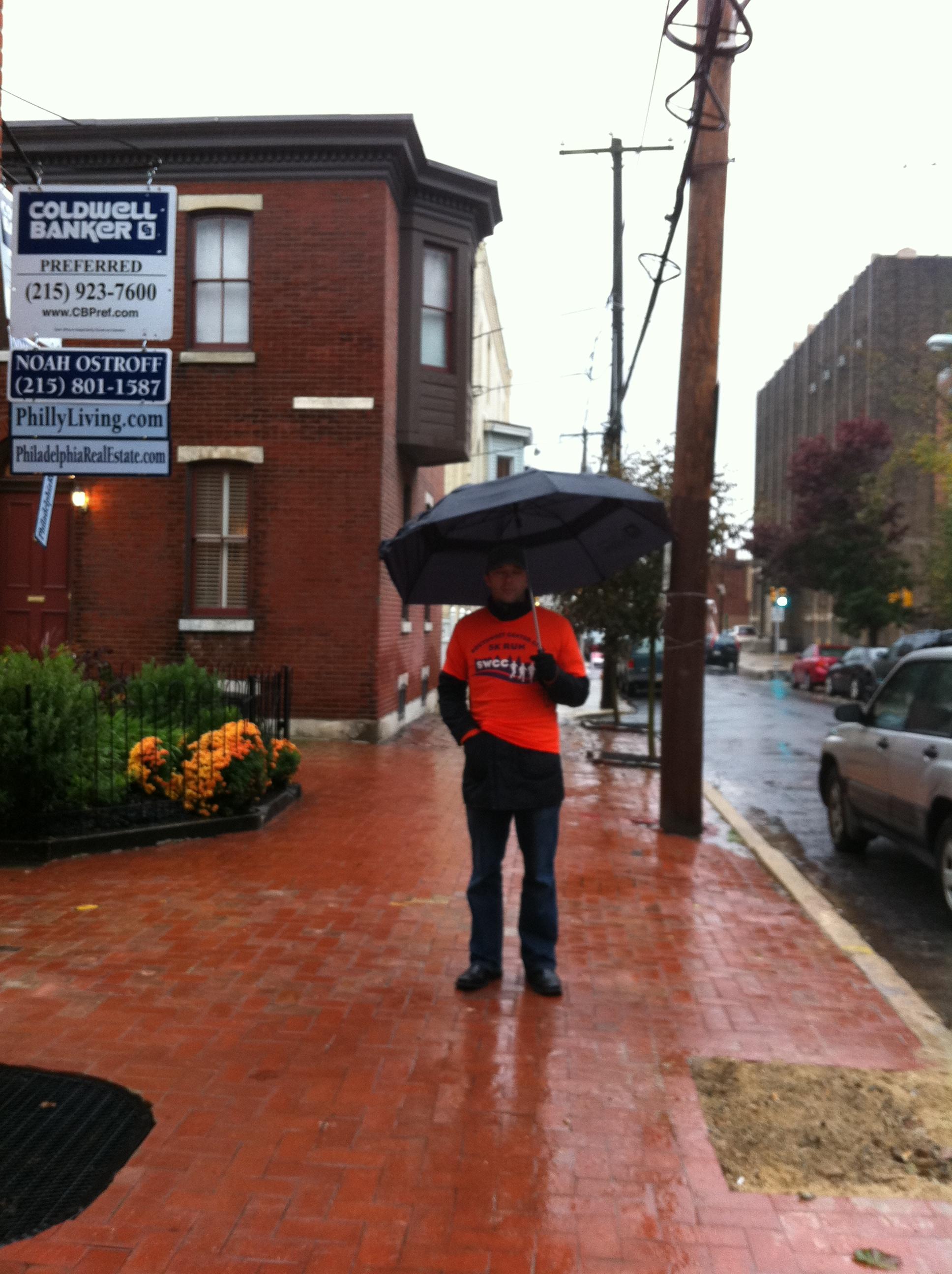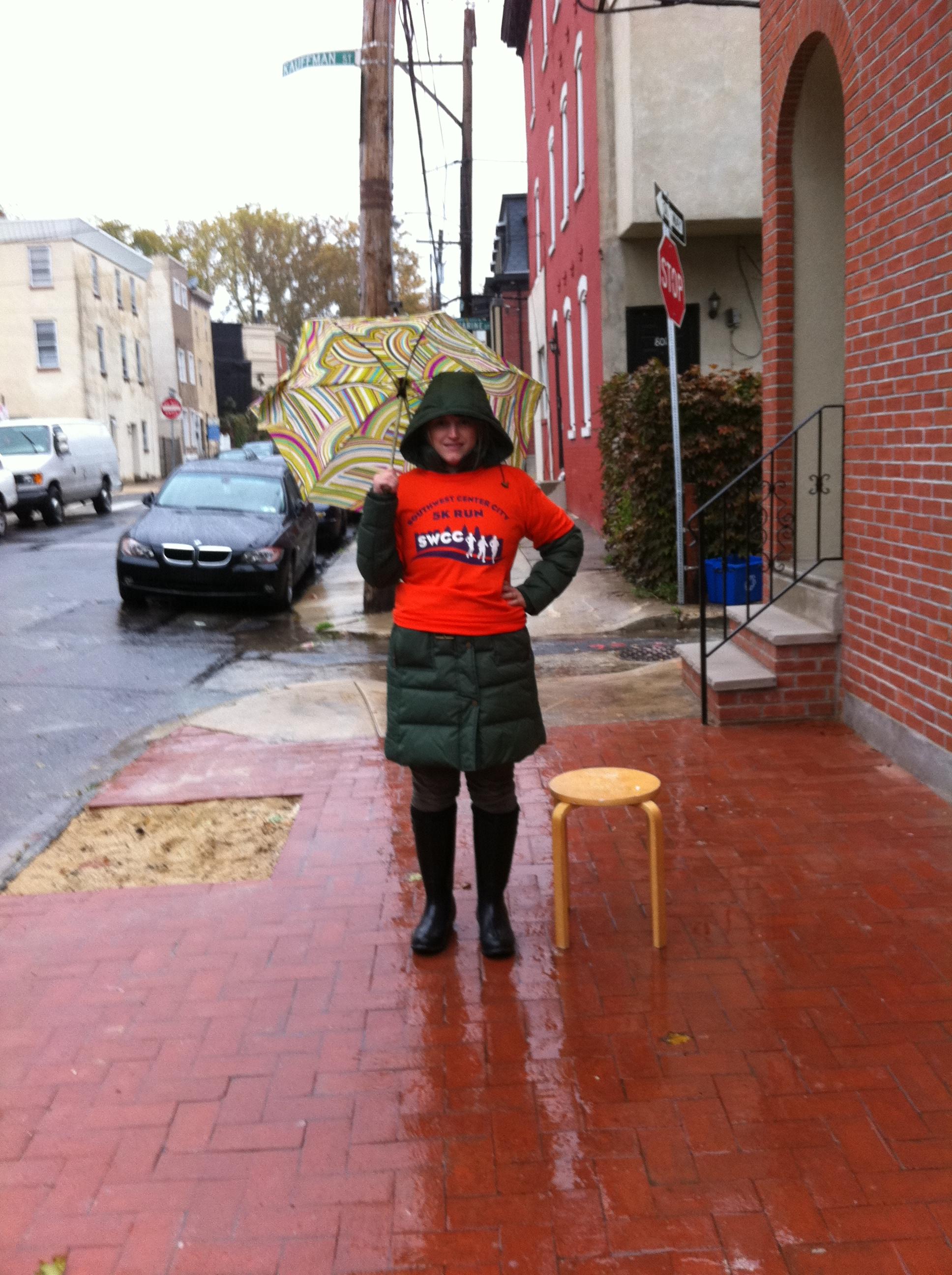 Rob & I, along with plenty of other volunteers and hundreds of hardcore runners, braved the pre-snow freezing rain for the Southwest Center City 5k Run this morning! It goes up, down, and around our neighborhood, including down Madison Sq. Here we are looking sorta-warm in our event staff shirts. Including my glam faux-rebroken-leg resting stool (not suggested for outdoor use):