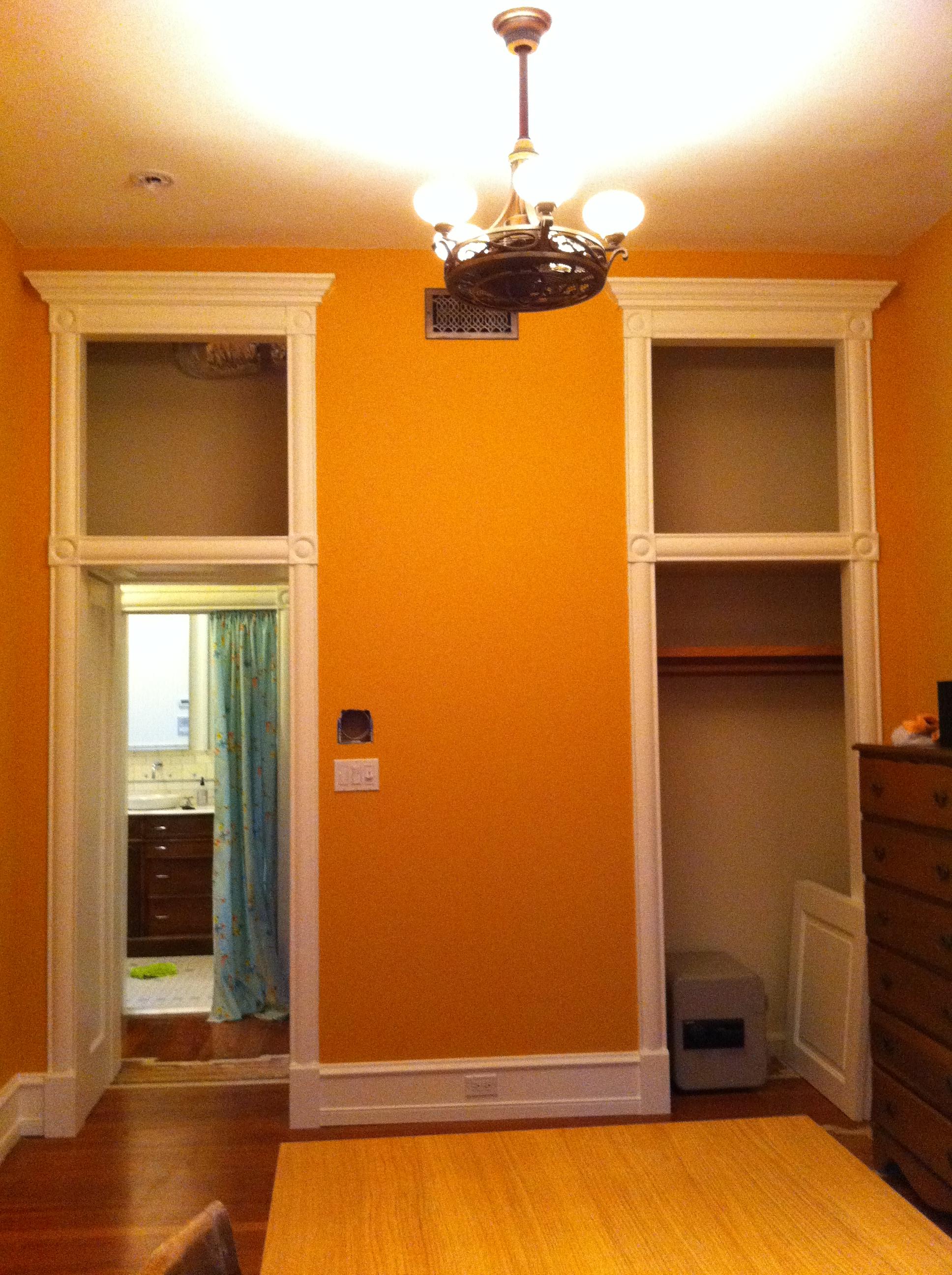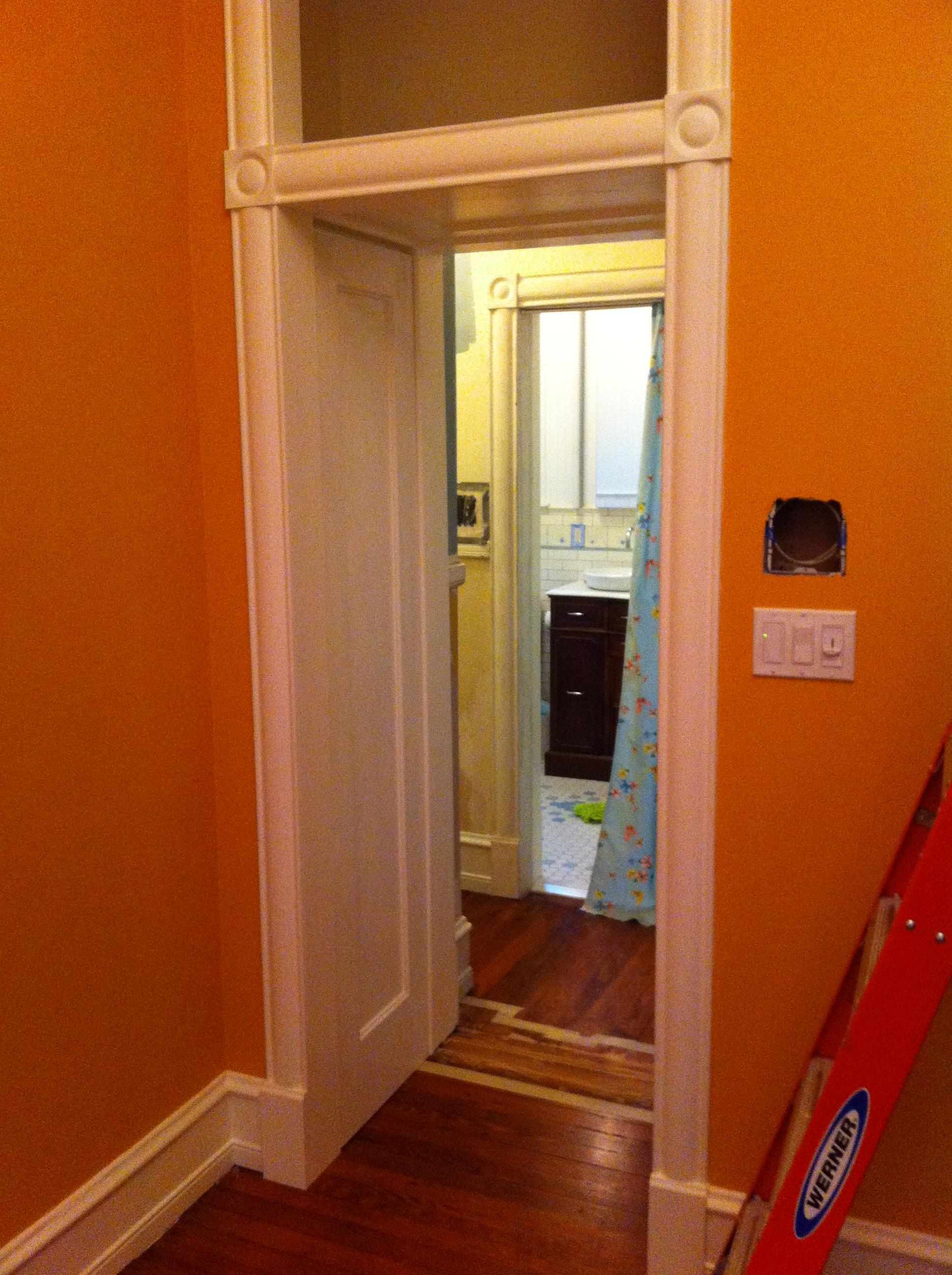 Here is a view to the hall with a test fit of the closet doors. You can also the area where we are refinishing the floor.
