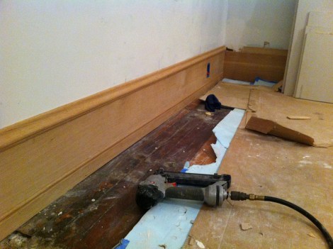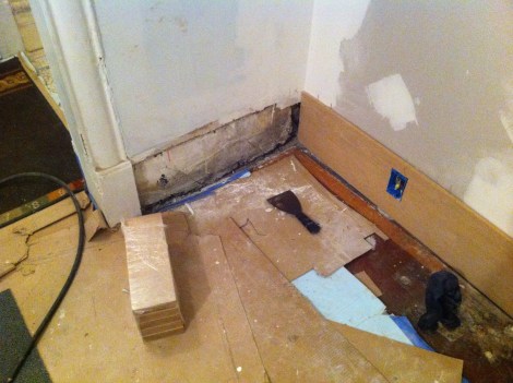 Back to getting that first floor heat- Rob has the base installed enough to reinstall the living room radiators. The little piece here before: