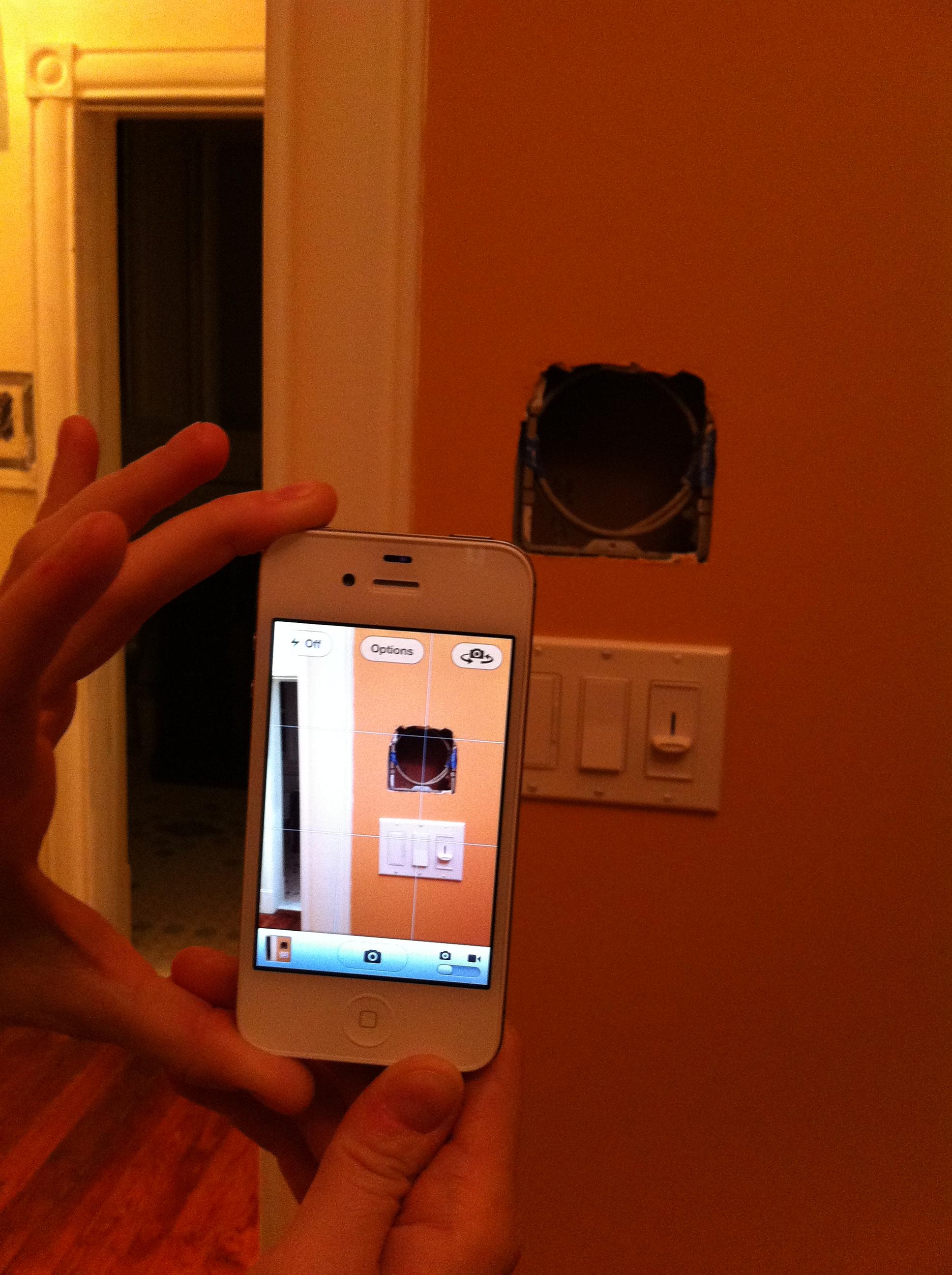 There was one more electrical item to cross off the list for the orange room (literally, we keep a list going on the iphone/ ipad at all times) – the intercom. Gaping black hole, wired & roughed out weeks ago. Here’s Rob’s iphone pic of my iphone taking a pic of the hole: