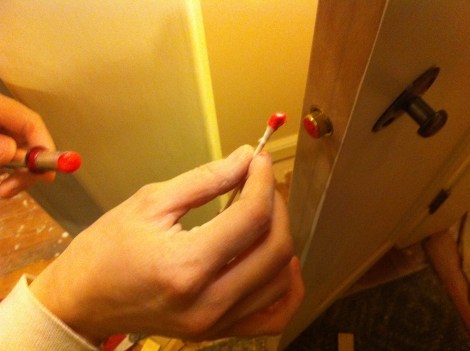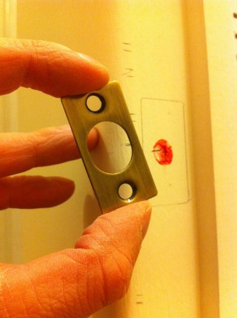 Here’s a trick for locating the strike plate in the jamb. Put lipstick on the end of the lock…