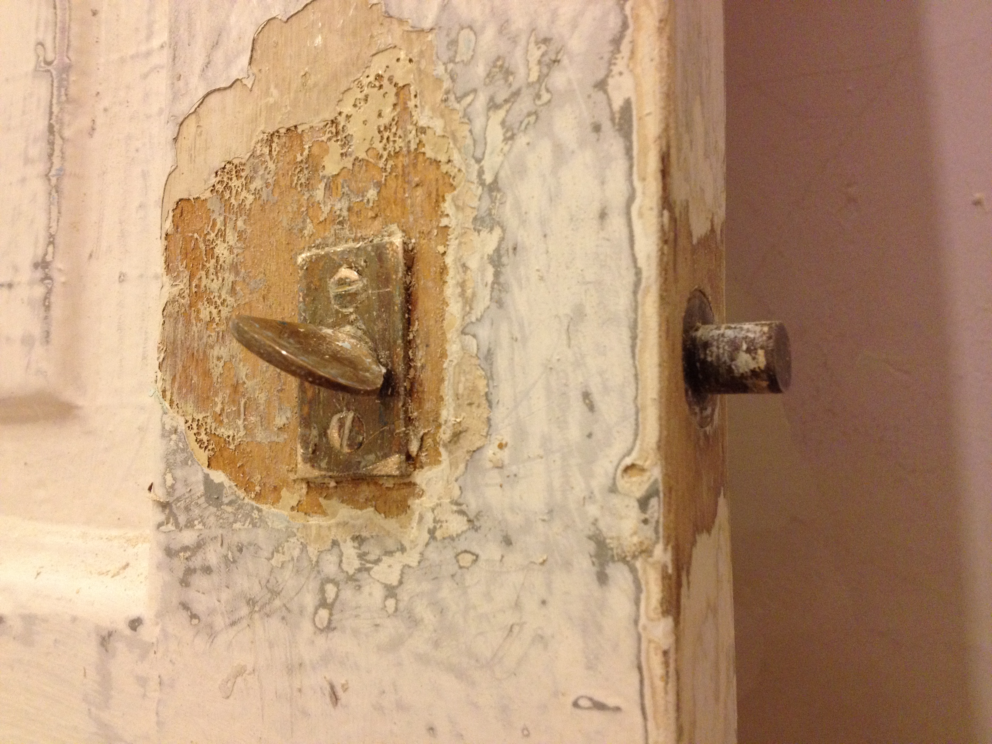 What is original and staying put is this thumb turn lock, which not unlike every other bit of the house was covered with paint. This is after I set it free: