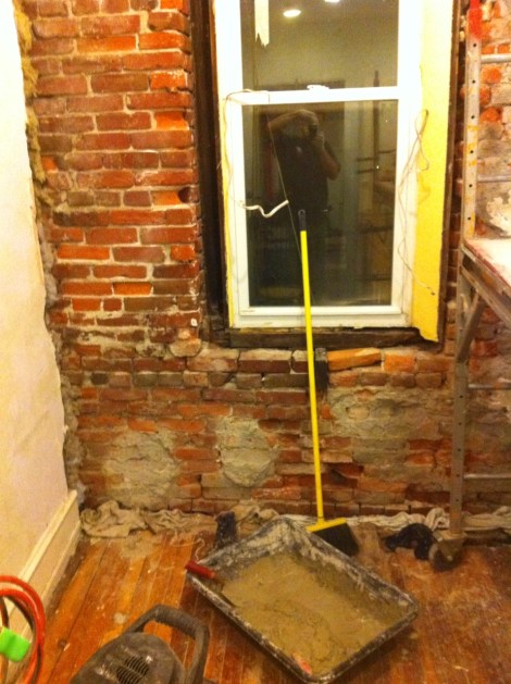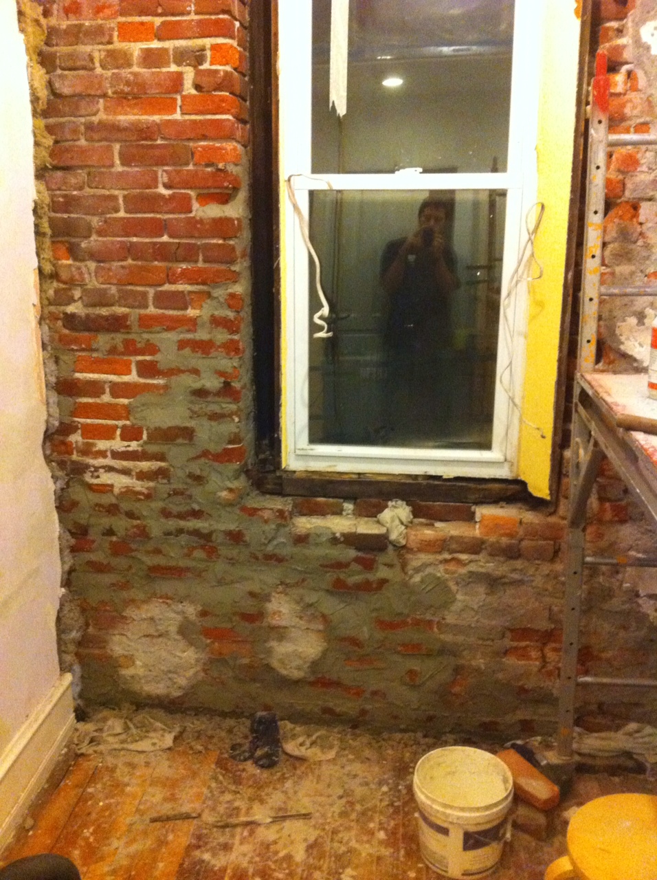 The mason and painter finally showed up for work today. Here’s the little bedroom wall beforehand, which needed some mortar-love: