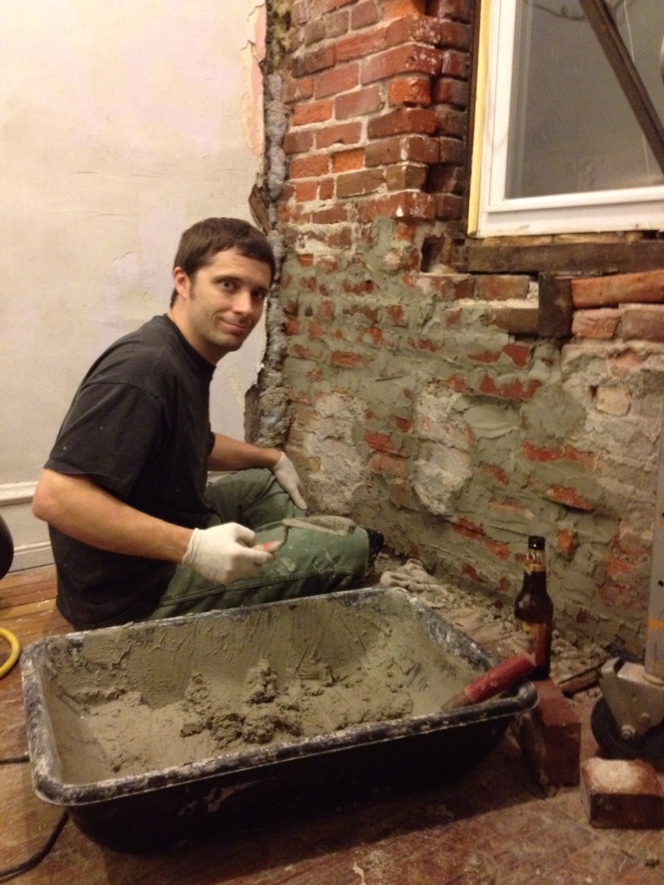 The mason at work… drinking on the job of course. (maybe that’s why the last wall was falling apart? 😉 All of this will be covered up soon so there’s no use in specialty pointing techniques: