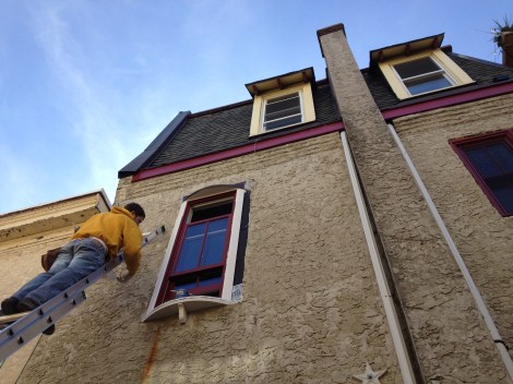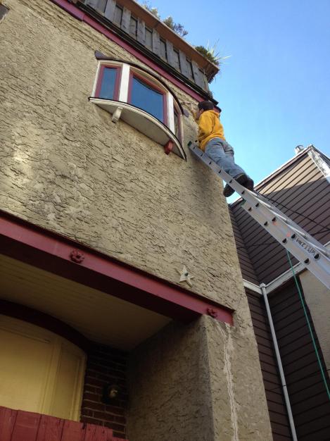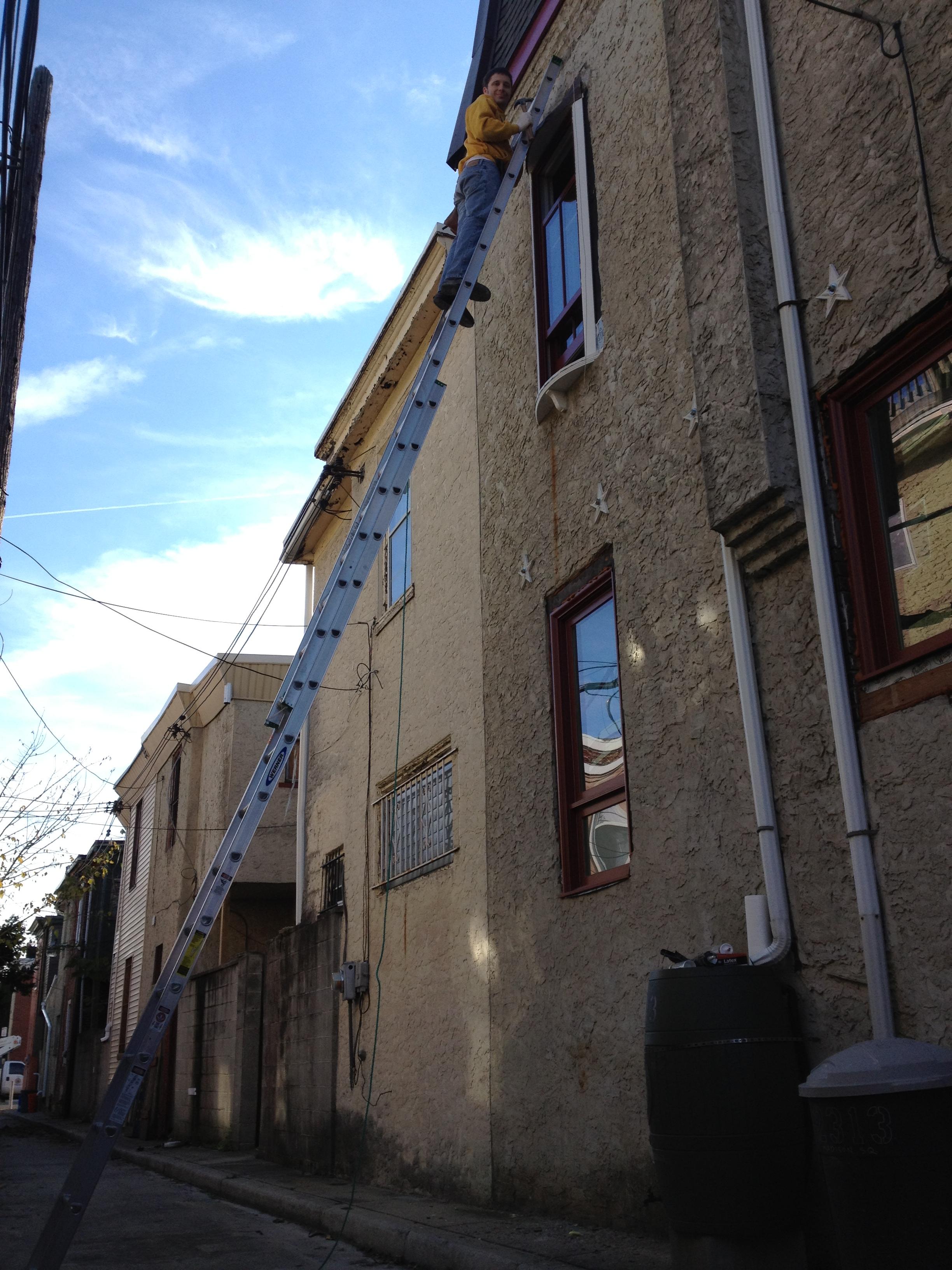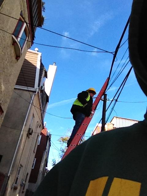 Meanwhile the city streets dept was replacing the light fixtures in the alley so at one point there were dueling ladders: