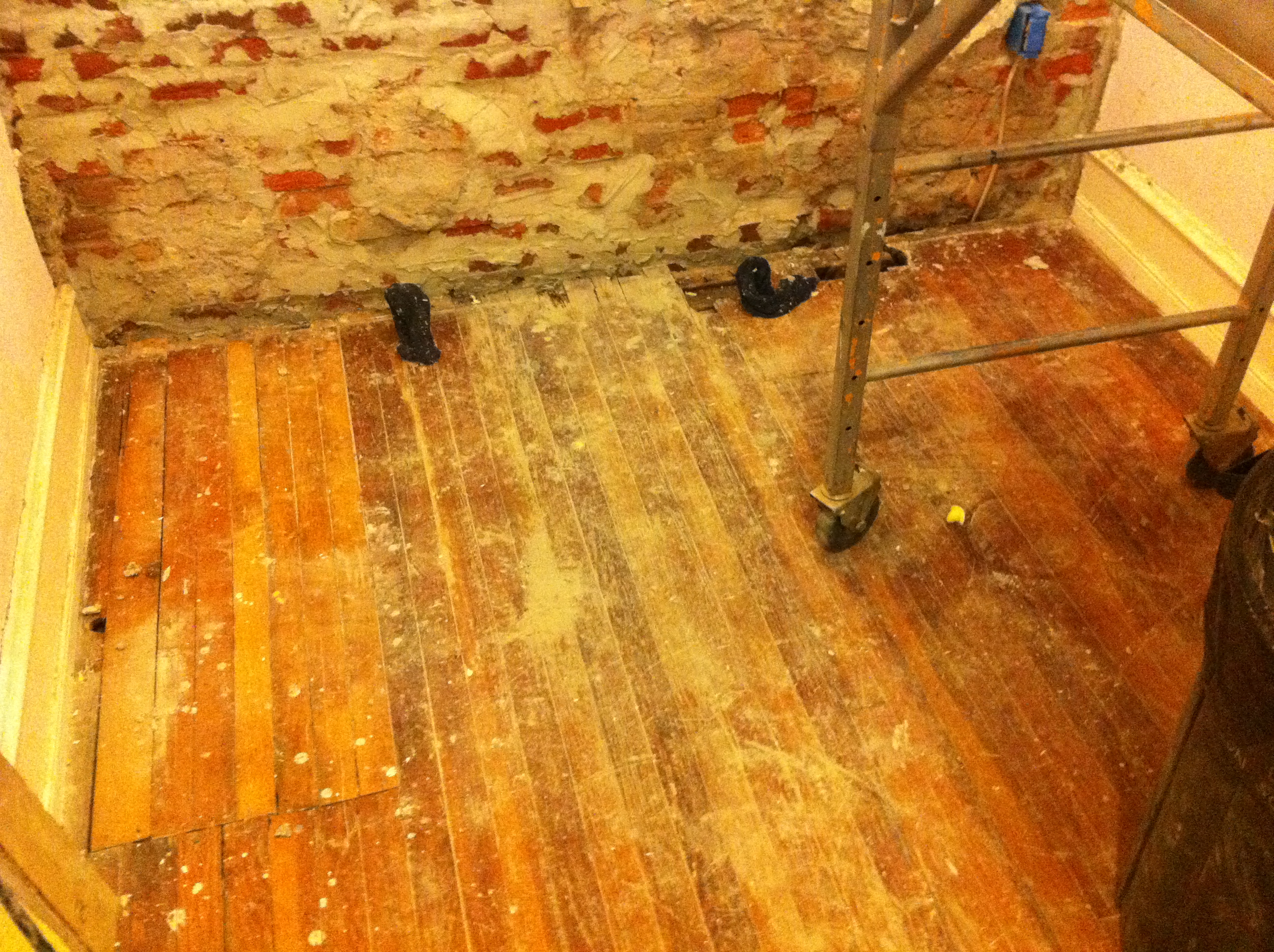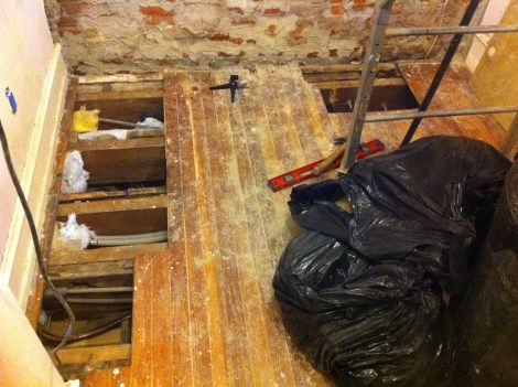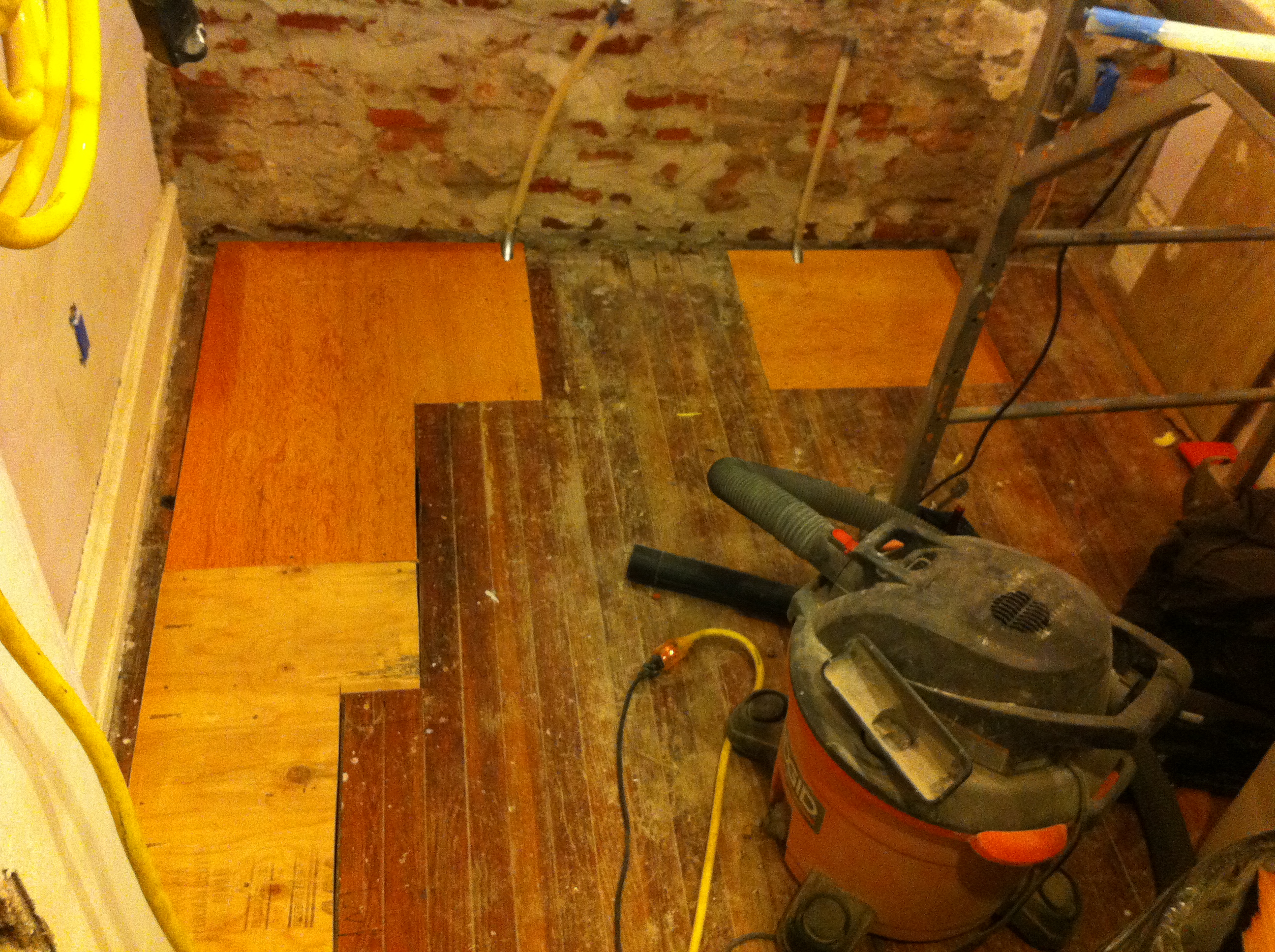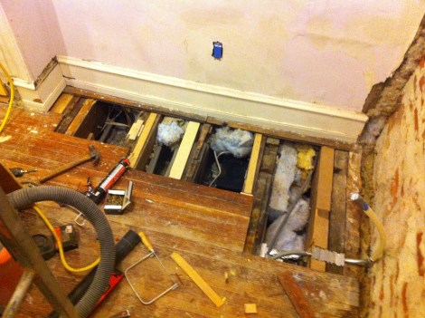 The past two nights have been spent on quick floor repair in the little bedroom. In the before shot below, it’s easy to see that the area of previous patching was exactly where we had to fix the floor. It was squeaky and did not feel solid at all. The area below the window was also shot due to all the openings from the old radiator pipes we removed. Before: