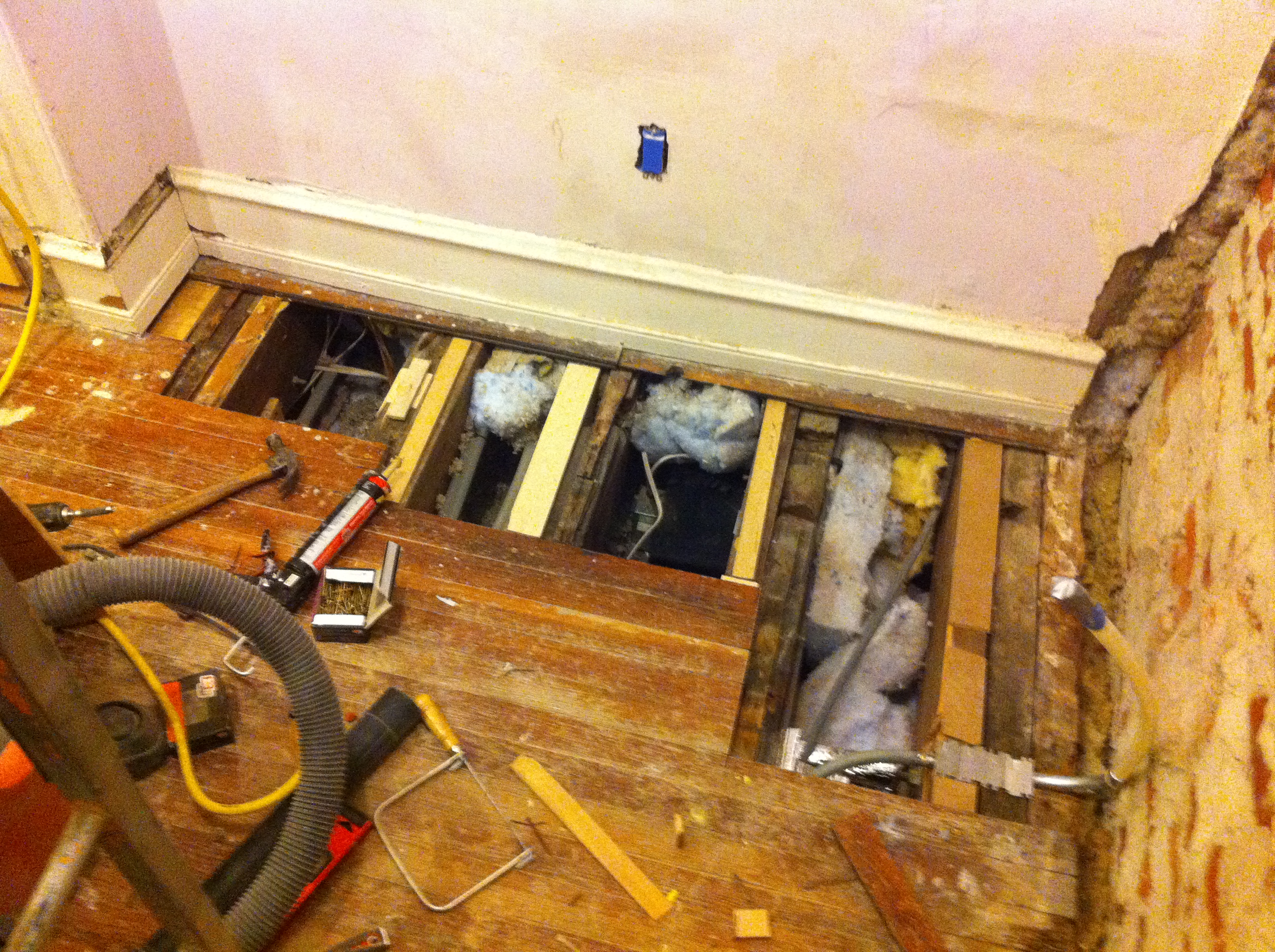 During- we added some more insulation for sound dampening in the joist bays we could reach: