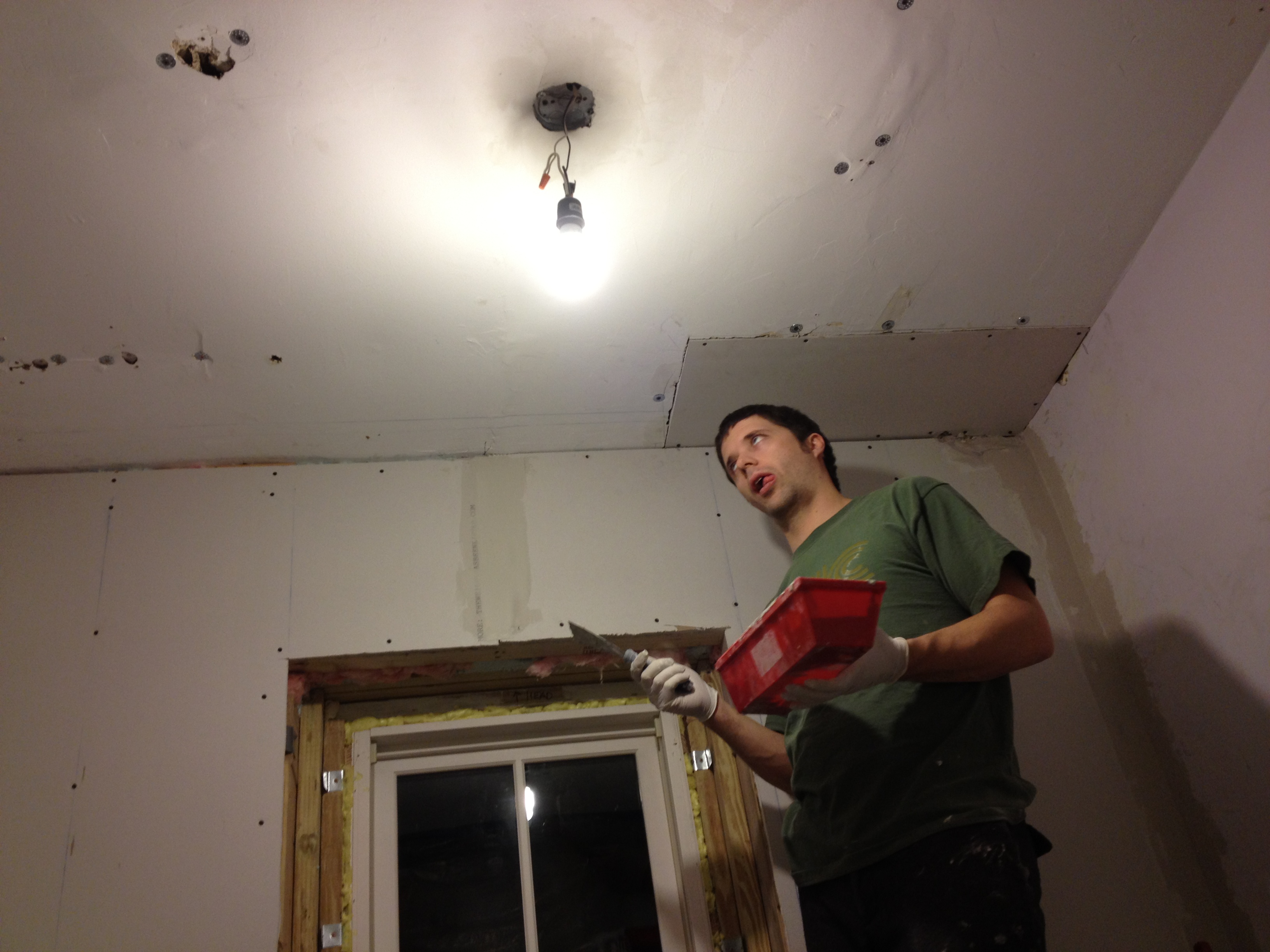 A night of spackle/ plastering/ mudding last night left us too tired to even post. Rare. So here’s the update you’ve been waiting for….