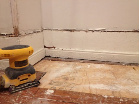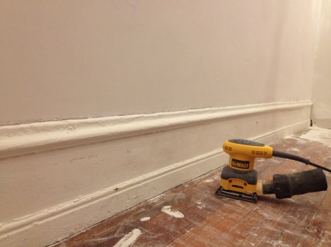 I’ve been hard at work sanding and smoothing out the loose trim stockpiles in the living room but now I’m taking my sanders on the road… To the little bedroom!