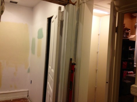 Tonight I paint-swatched it up in the little bedroom (and living room; more on that later). We had some ideas of course and paint of course so it was just a matter of painting and deciding on a color…sounds easy! Here’s a view from the hall into both guest bedrooms and closet: