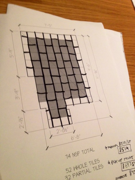 We’re pretty excited because we found a great deal on cork tiles… it’s on sale for the unheard of $1/ SF. The cork we liked the most, “Pick up strips”, was ~$7, the “Medium” was ~$5, and those were trade discounts! We’re did the math and are pretttttty sure that we can be happy with the DOLLAR a square foot cork, because at that price we can afford a new light fixture. And the adhesive to hold down the cork. Maybe a cute rug in here too. And still have money left over for some groceries. Here’s the new floor plan…