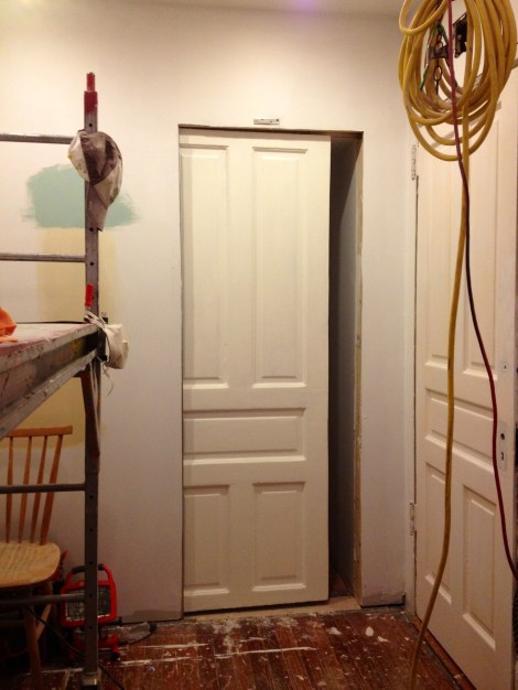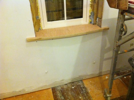 Sometimes we have one task we tackle together for the entire night, and some nights we divide and conquer. Tonight we did a little of both. I’ll start with the coolest. Rob made the window sill for the little bedroom! It has a sweet little curve to it. Love: