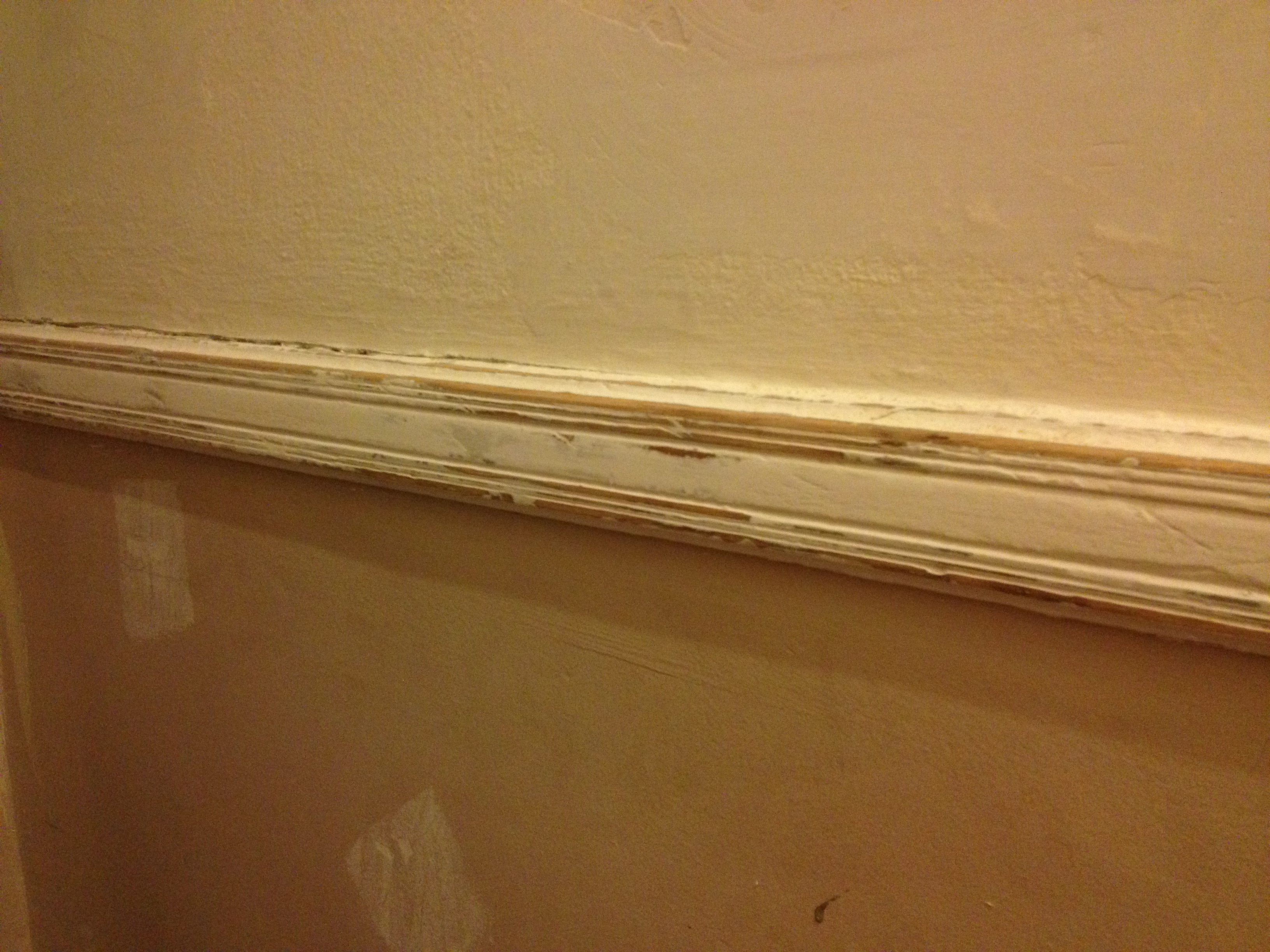 I sanded a ton of the hall trim. It’s really one of my favorite things to do since I basically lay sideways with a mask on in piles of paint chips with a palm sander. Once I’m done I will encourage all visitors to byo magnifying glass and check out my work. Here’s the chair rail because I wasn’t laying back down to get a picture of the base: