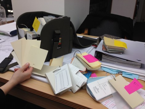 Making a mess of my desk earlier in the evening at work in search of the “perfect” warm neutral tan sandy beige but not too yellow or peachy or with green undertones paint color. We’re getting some testers tomorrow: