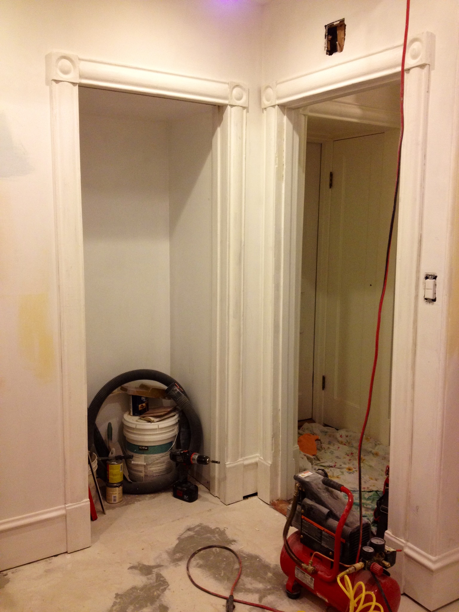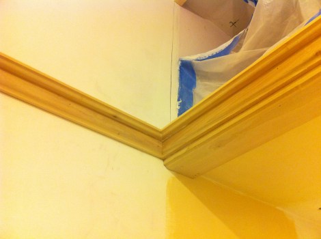 Trim & Paint January 3, 2012 · by madisonsquare · Bookmark the permalink. · The trim is primed (most of it) in the bedroom. The reused yellow trim… After:Primed… And what’s that on the sides? A self milled picture rail! It’s going around the room at the same height as the lower ceiling. We have a painting concept you’ll see soon! More primed trim….Tomorrow it’s Pot Of Cream time: Share this: Click to email a link to a friend (Opens in new window) Email Click to share on Facebook (Opens in new window) Facebook Click to share on Pinterest (Opens in new window) Pinterest Like Loading... Related