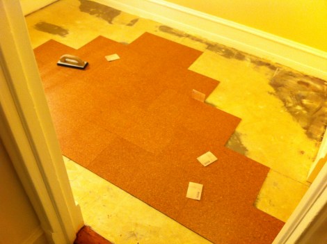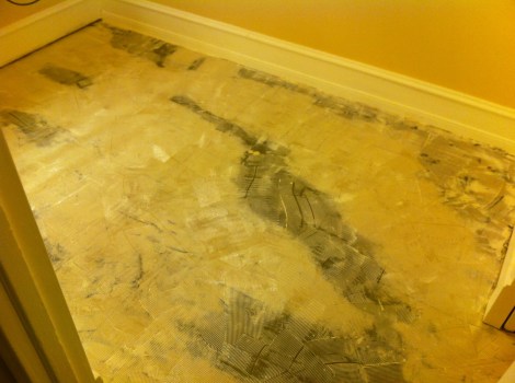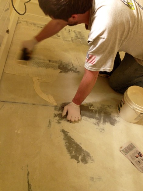 The adhesive is similar to rubber cement- first you trowel a layer directly on the floor: