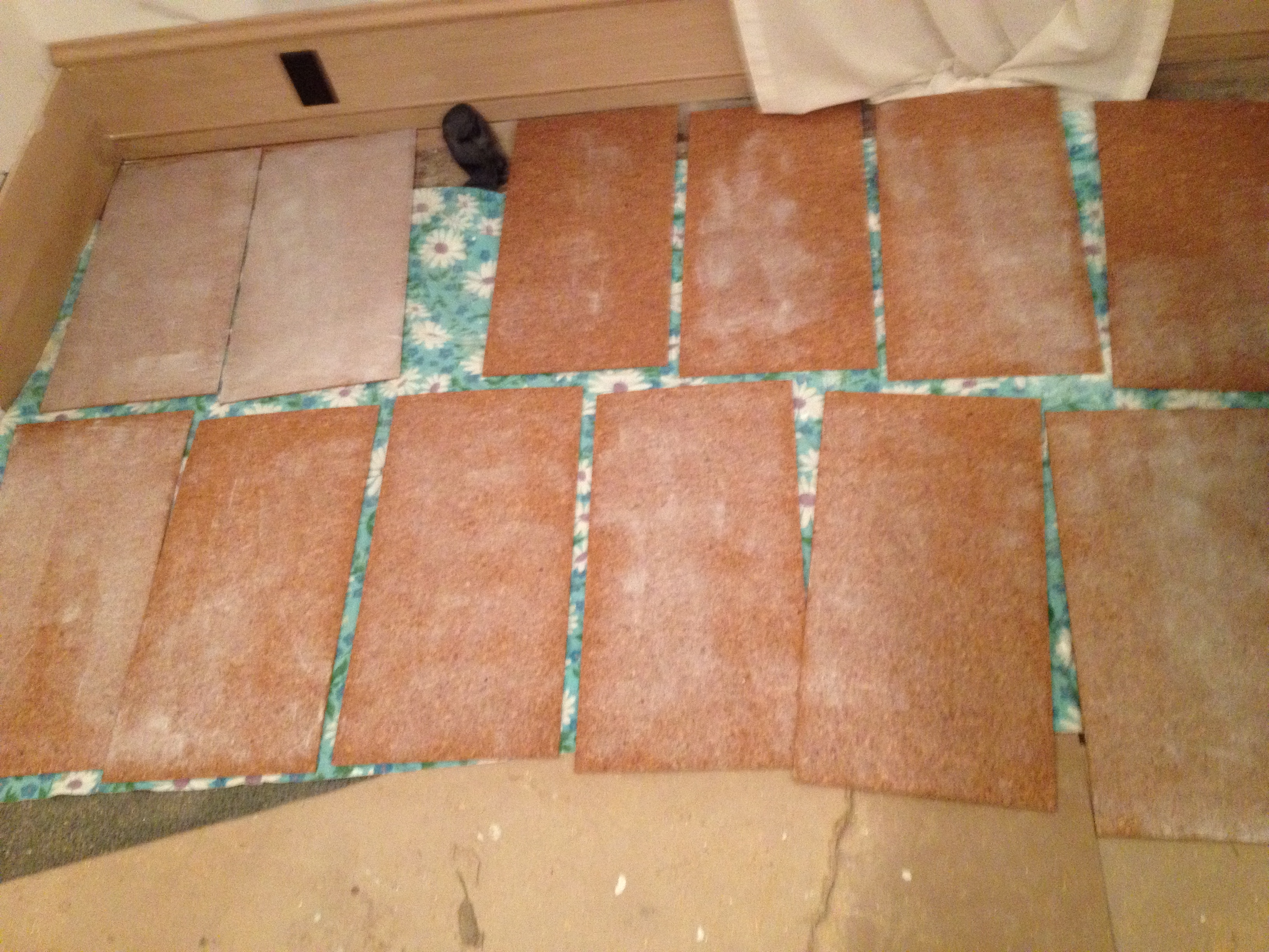 The adhesive had to “flash” (dry) for 15 minutes or so on the back of the tiles, here they are drying: