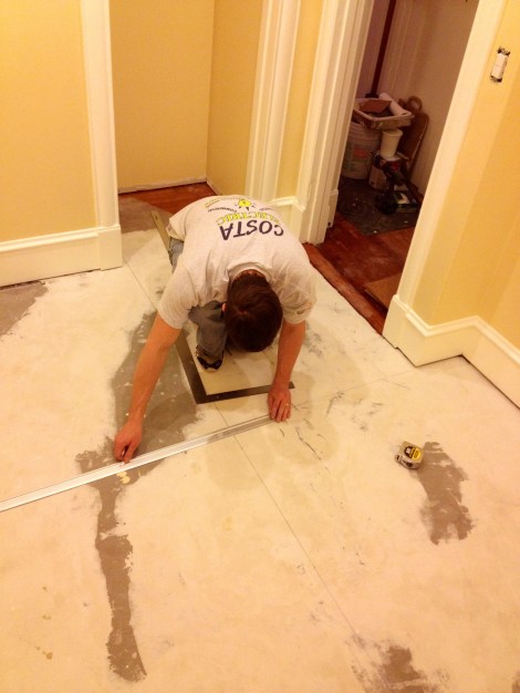 The first step (after confirming a solid substrate and deploying the self leveler) was to clean the floor and decide on how to lay out the 12×24 tile. Once we had a decision we sketched a grid on part of the floor: