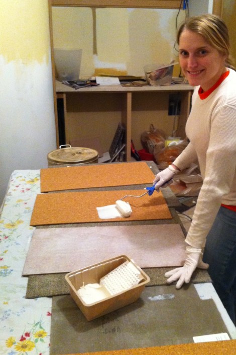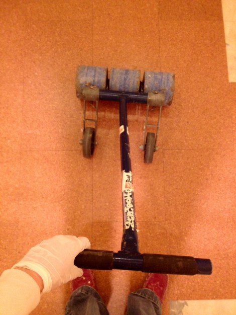 Then we used the little roller to put a thin layer of adhesive on the back of each tile. There were about 40 or so tiles, so it took a while. (I have like seven layers of clothes on because it was freezing out and we had to run to Home Depot right before hand to rent a roller… More on that later.)