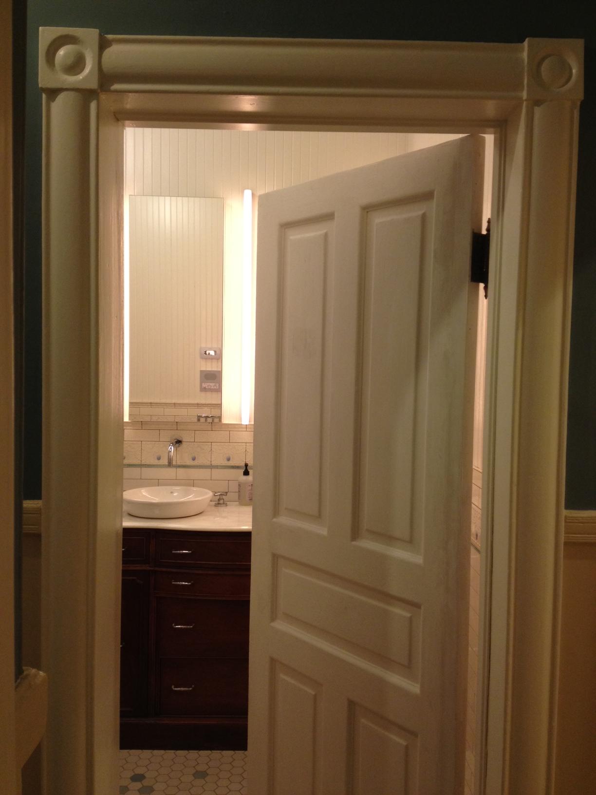 We’re lucky that most of the doors are original to the house and in good condition. Some of the small closet doors we made using mdf and a router. If you’re looking for old paneled wood doors, try looking at an architectural salvage place, flea market or craigslist instead of an antique shop. Good luck!